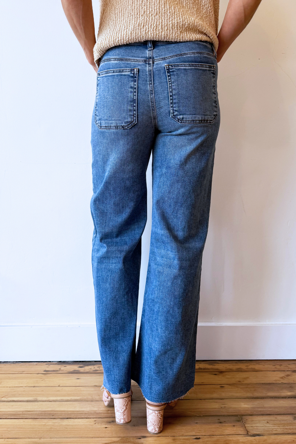 These Maya high rise wide leg jeans are a statement denim staple with a modern edge. Designed with a flattering high rise and signature porkchop front pockets, they offer structure while still feeling effortlessly cool. The raw hem and wide leg silhouette make them perfect for dressing up or down.