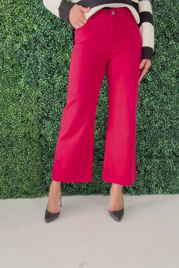 A vibrant hue refreshes the style of these subtly faded, raw-hem wide-leg jeans fitted with Fab Ab front pockets that comfortably shape and smooth! Dress it up with a sweater and heels or down with your favorite graphic tee and sneakers!