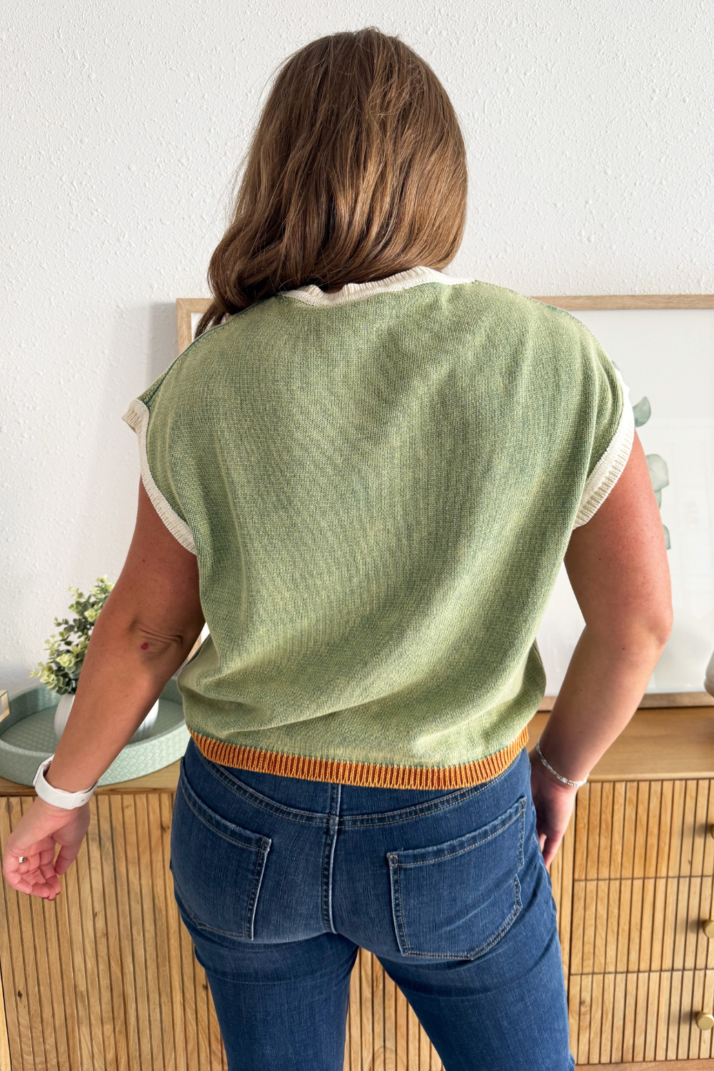 Perfect for wearing on its own or layered over a basic, this Mineral Washed Sleeveless Sweater will be perfect for fall! Featuring contrast trim around the cuff, neckline, and hem, this top is simple yet stylish! Pair back to your favorite denim and heels for a night out!