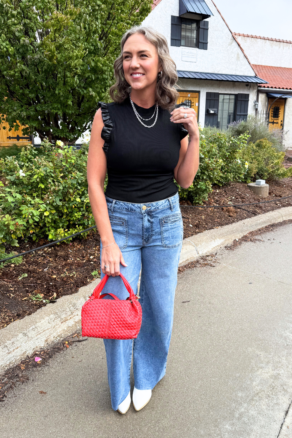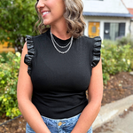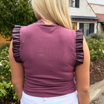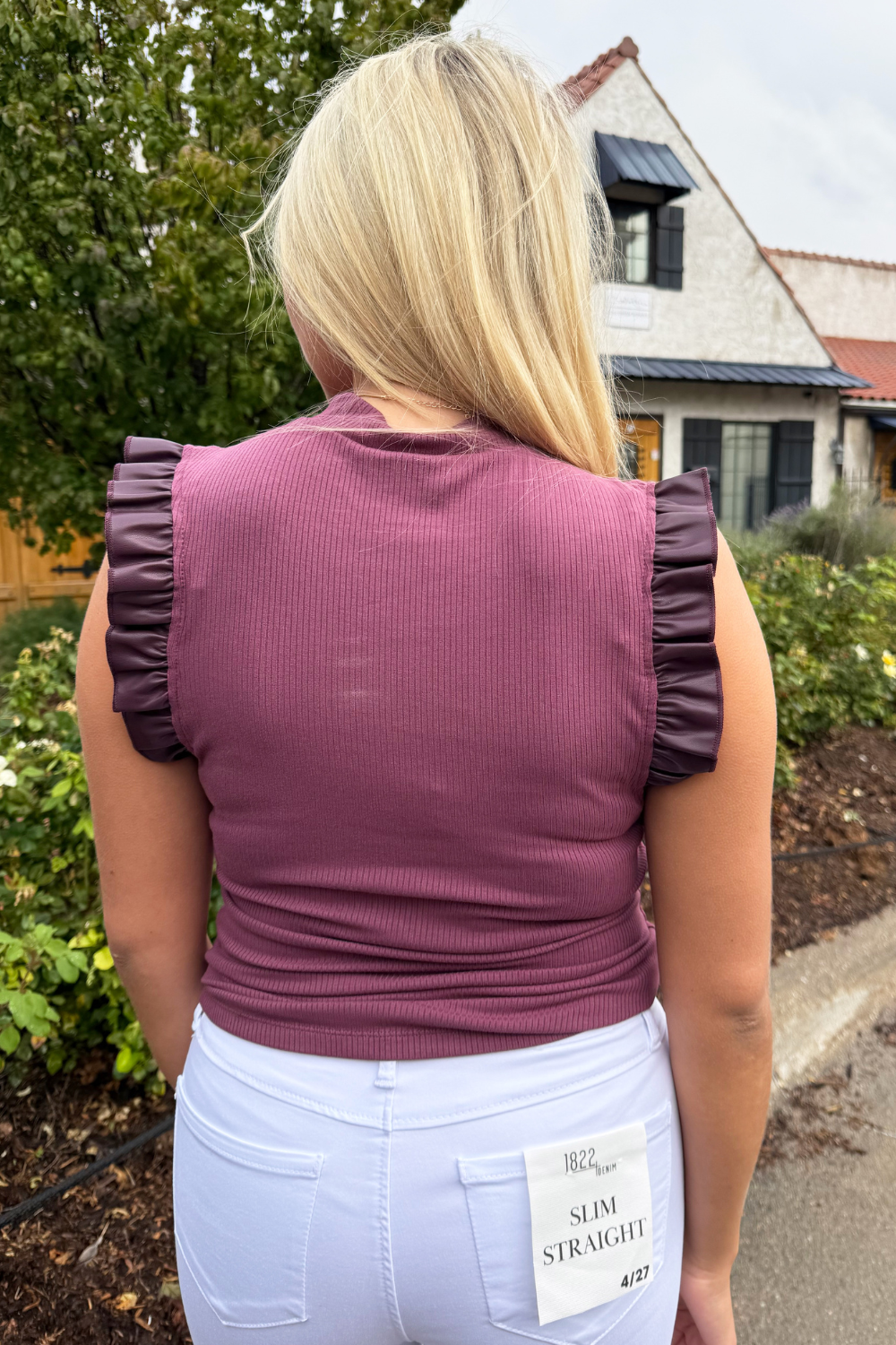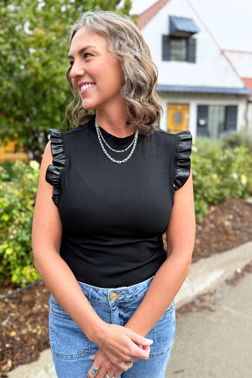 This mock neck faux leather tank top makes a bold statement with its sleek finish and touch of leather detailing! The ruffle sleeves add a touch of feminine flair! Perfect for a night out, this is a standout piece designed to tuen heads!
