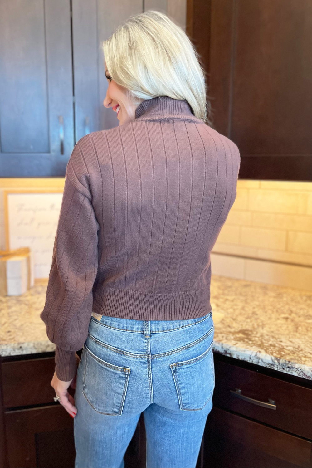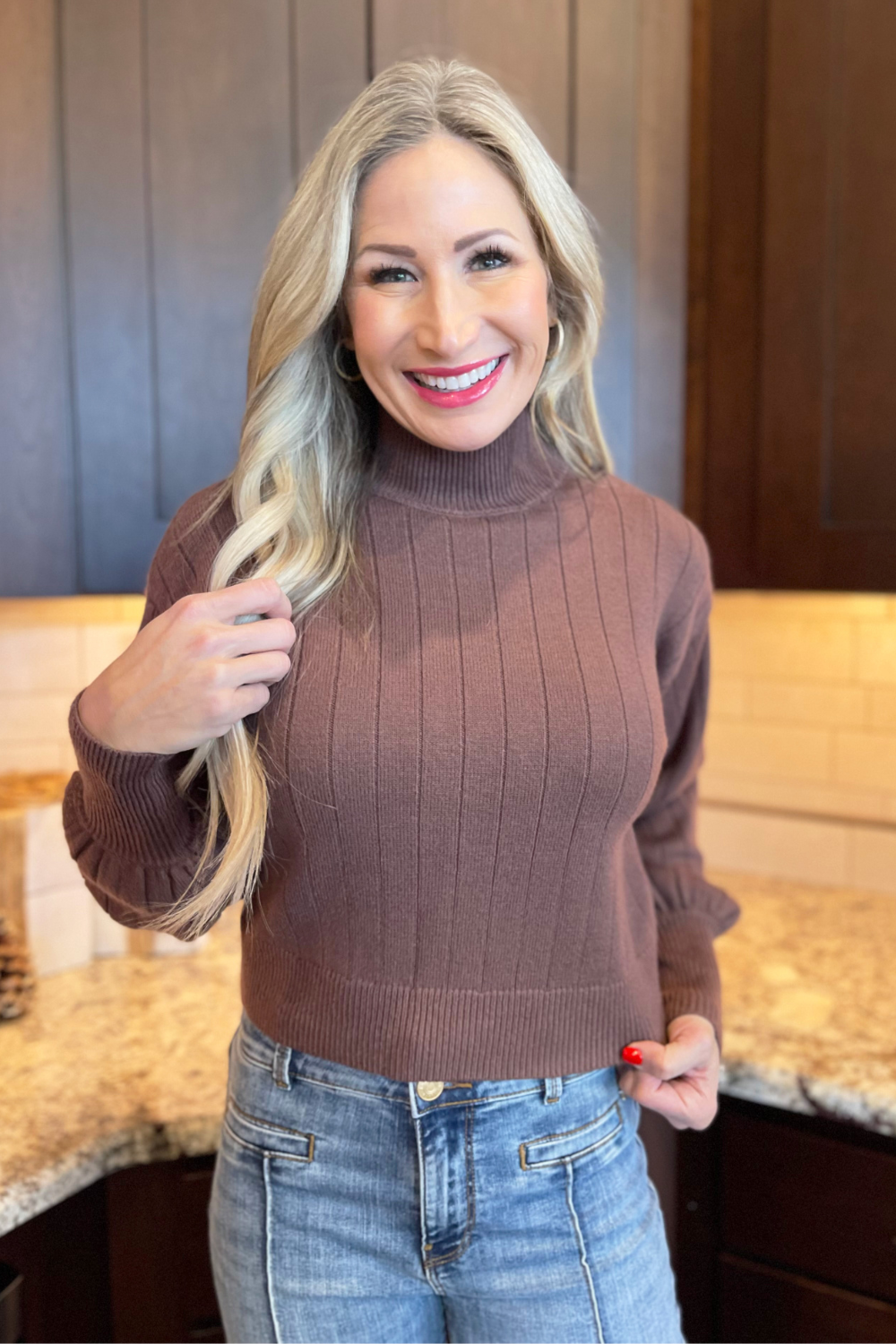 The Mock Neck Ribbed Sweater will keep you warm and cozy in cooler temperatures. The mock neck and balloon sleeve add extra style to this classic sweater. Pair it with denim or your favorite trousers.
