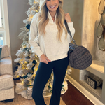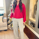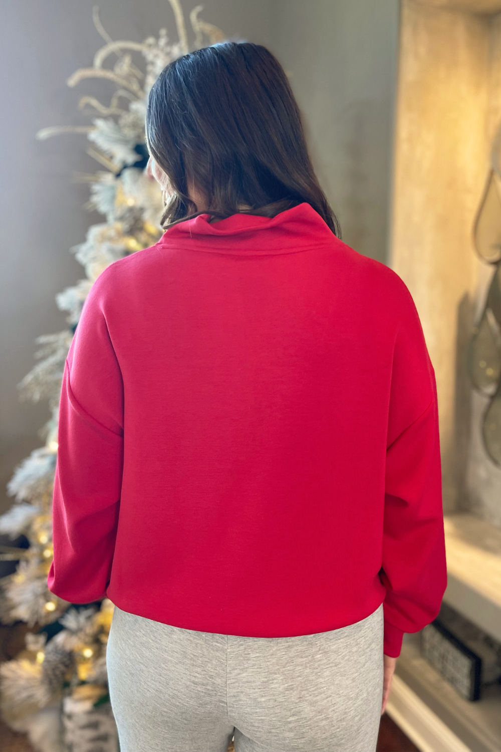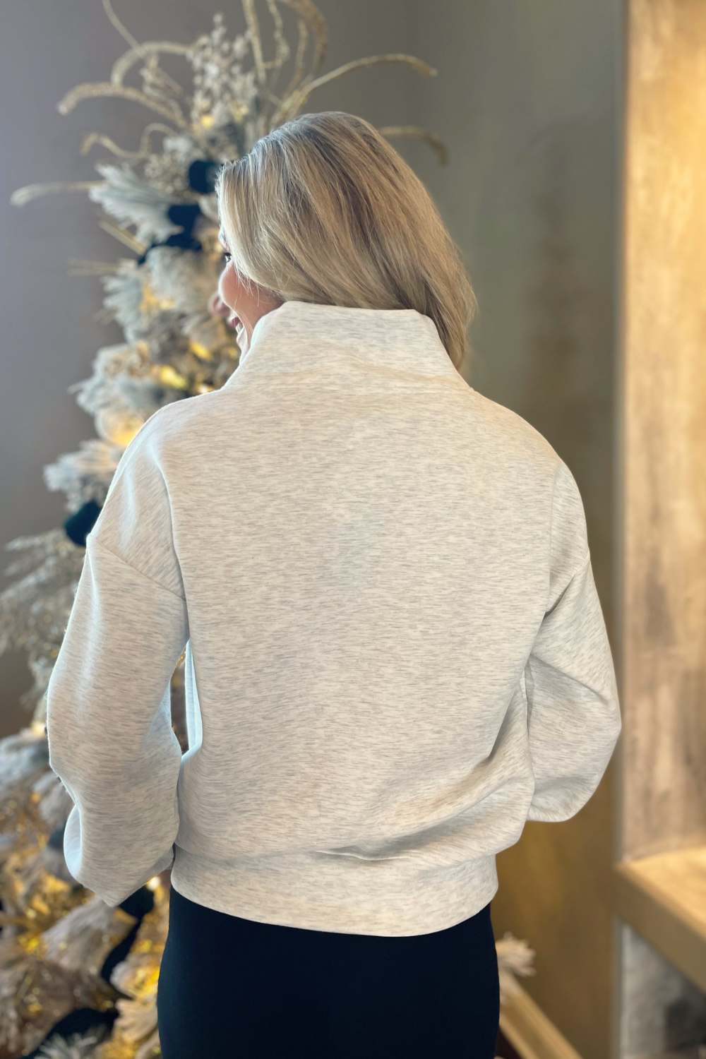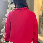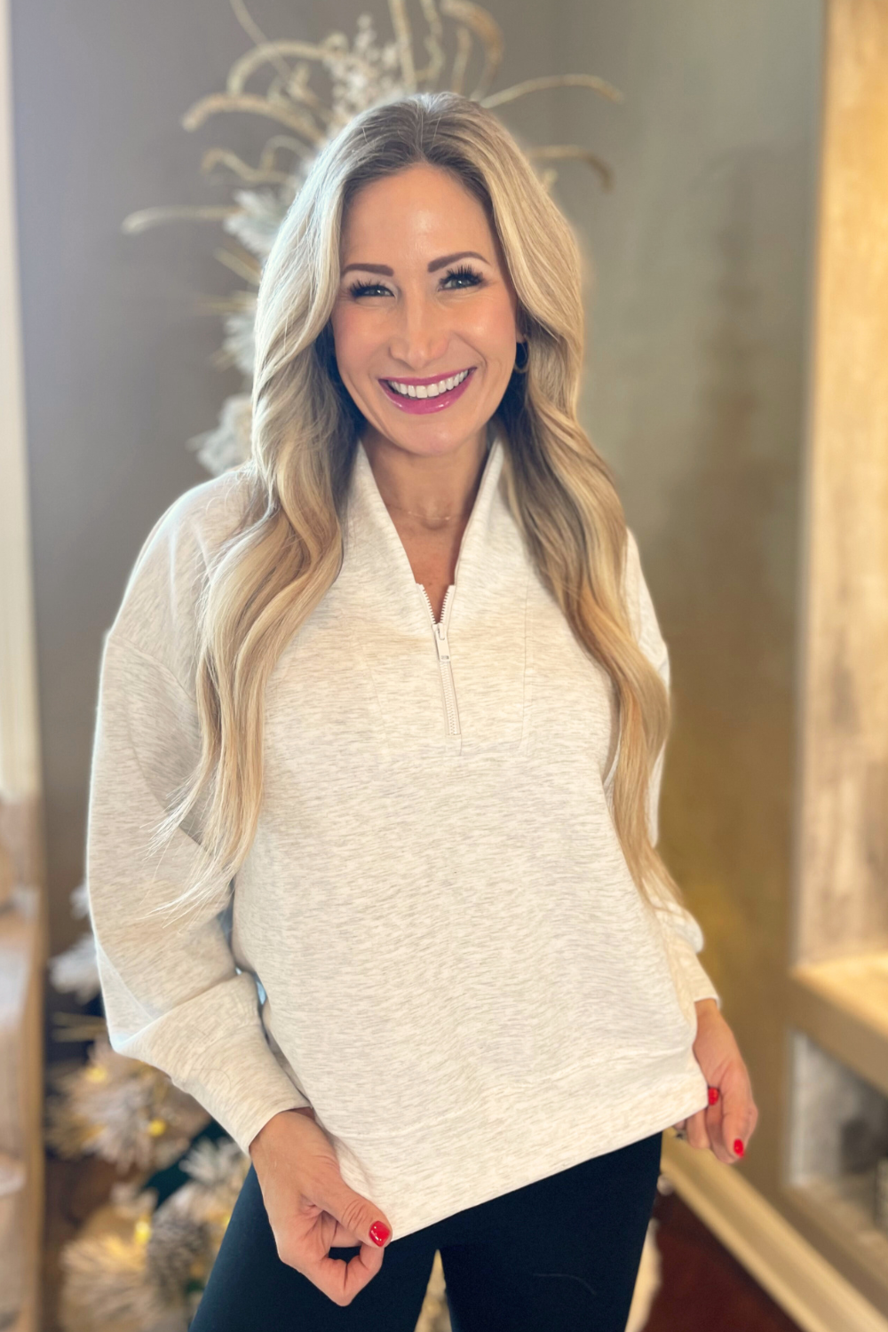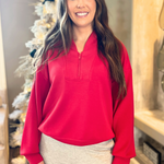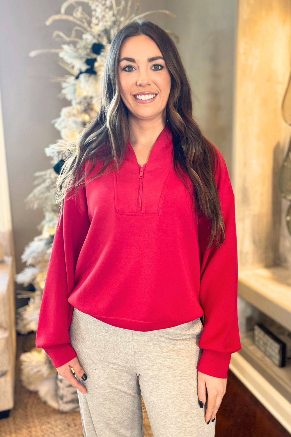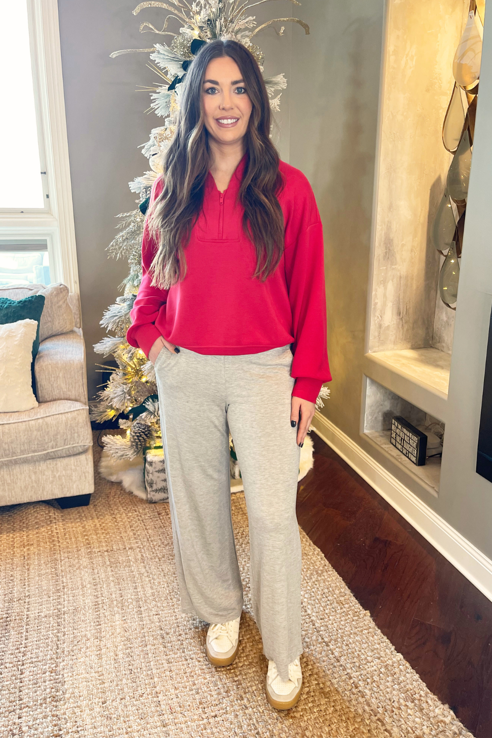 The Modal Scuba Luxe Half Zip Jacket is exceptionally soft and lightweight. The silky smooth fabric has a luxurious feel and the oversized fit gives the jacket a laid back vibe. The jacket has bubbled sleeves and a half zip closure, plus a convenient front pocket! Pair it with the Everyday Modal Flare Pant in black to get Erin’s look.