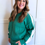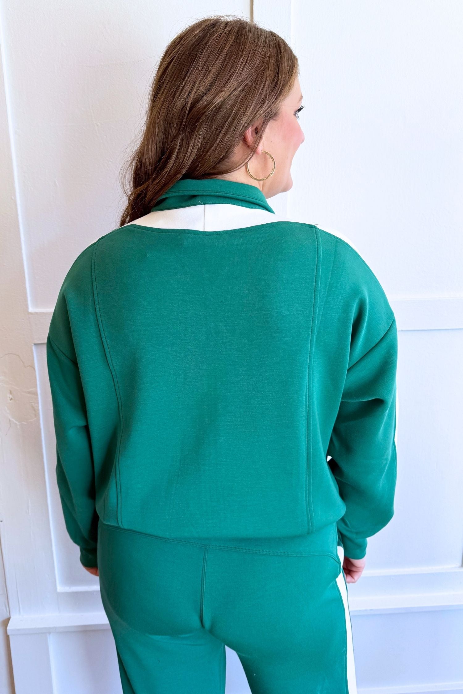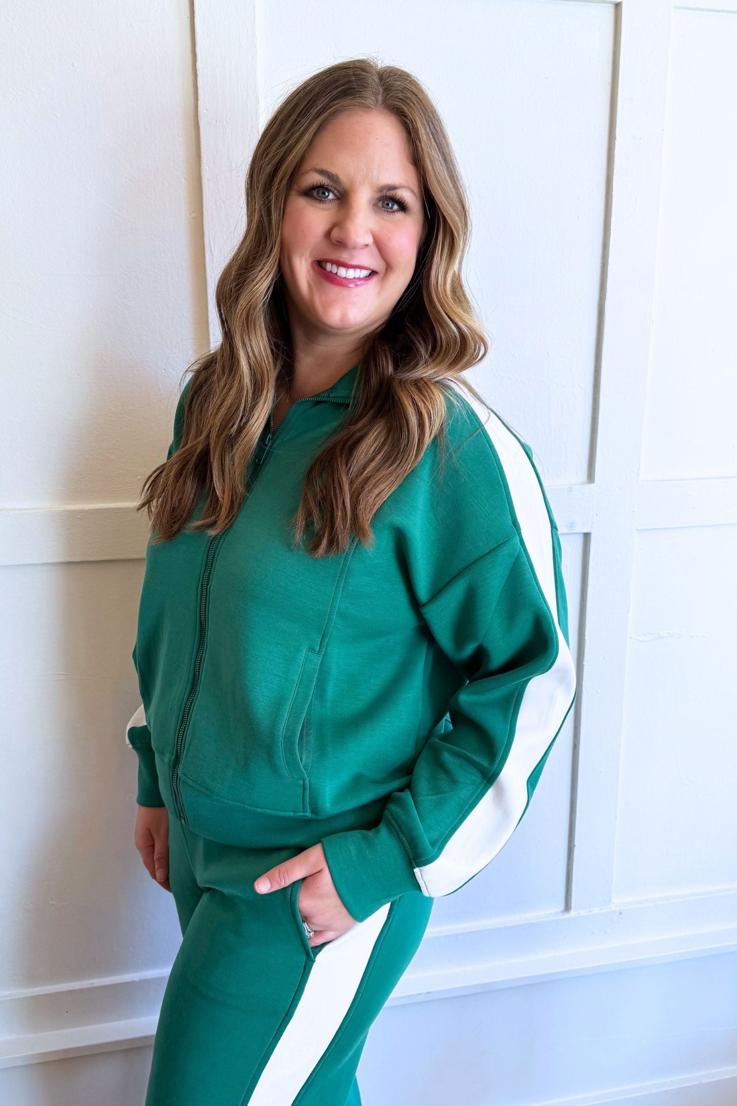 A sporty-chic zip up jacket made from soft modal scuba fabric for a smooth, comfortable fit. Features contrast cream striping along the sleeves for a flattering, elevated look that’s easy to wear on the go.