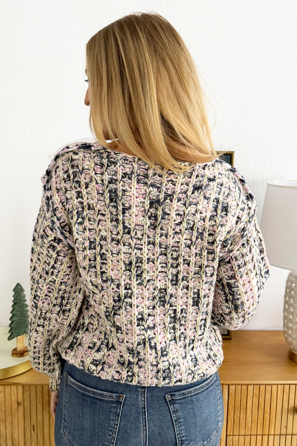 This sweater knit in lurex fabric is perfect for any occasion! Featuring a v-neckline, dropped shoulders, and ribbed trim! This sweater can be dressed up with your favorite denim and booties or heels for the perfect winter look!