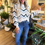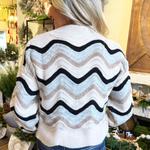 A fun twist on a classic, this wavy pattern sweater will add a bold piece to your cold weather wardrobe! Featuring multicolor wavy stripes and a scalloped hem, this sweater pairs effortlessly back to denim!