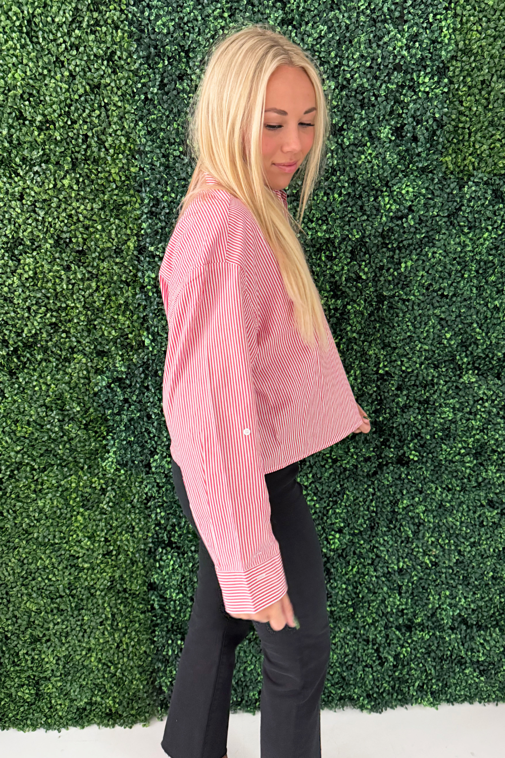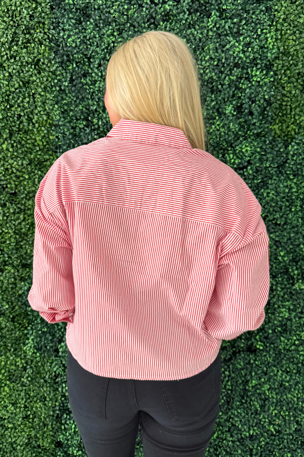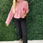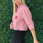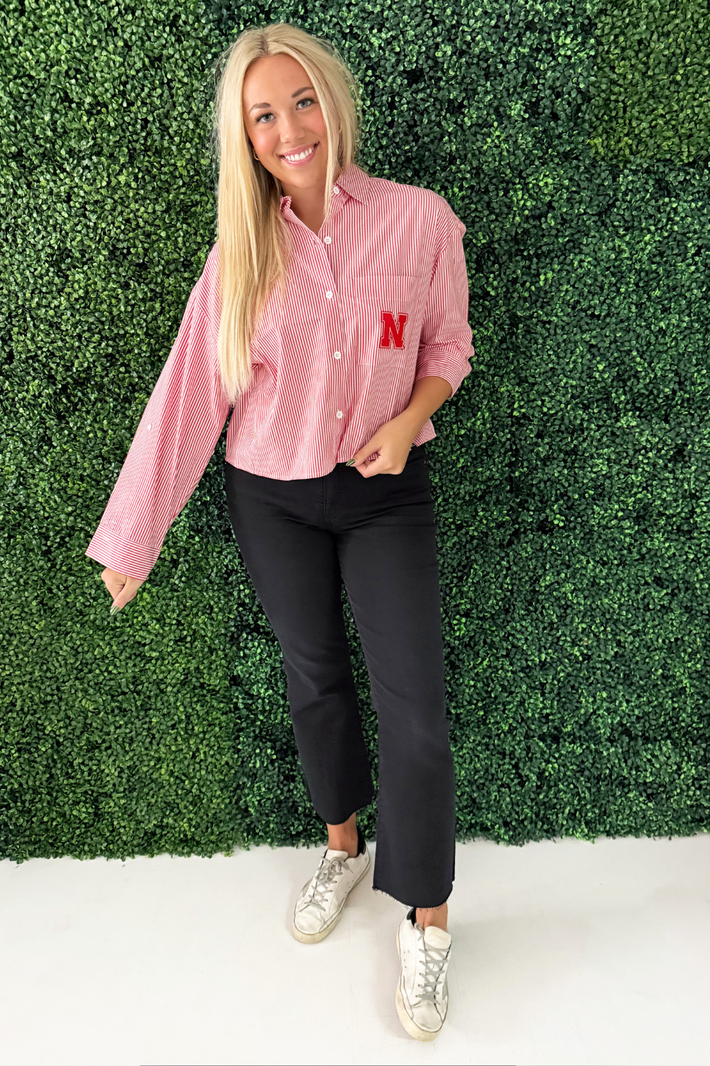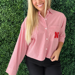 Show your state pride in style with this striped button-up featuring a bold Nebraska logo patch. Its crisp lines and classic silhouette make it perfect for layering or wearing solo, giving you an easy, spirited look that pairs effortlessly with denim or your favorite jacket!