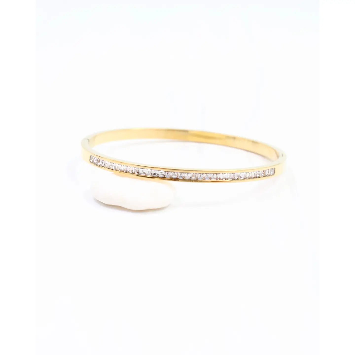 The Nell Bangle Bracelet features a delicate row of sparkling cubic zirconia stones that add a subtle shimmer to your wrist. Designed with a tension hinged closure, it offers both secure wear and easy on-and-off convenience. This elegant piece complements any outfit, making it a versatile addition to your jewelry collection.