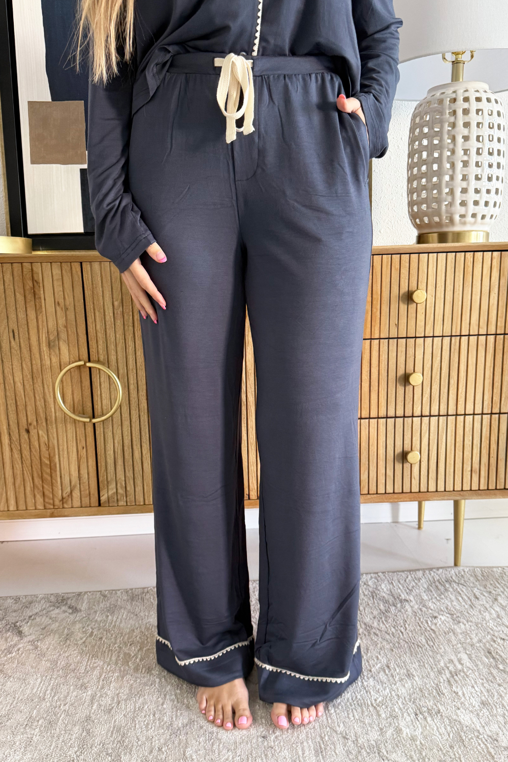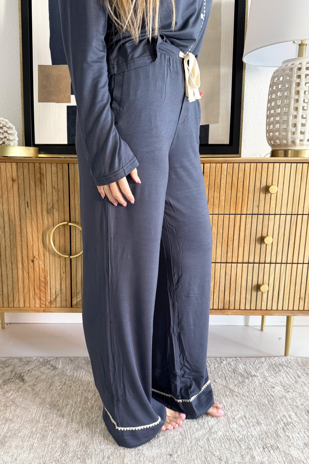 Get cozy in this classic pajama set featuring a button up top and matching drawstring pants. Made from soft, breathable fabric, it's perfect for lounging in comfort and style. Whether you're winding down for the night or enojying a lazy morning, this set keeps you effortlessly chic.