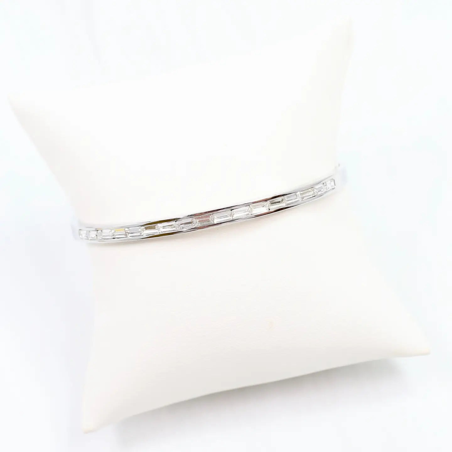 This Nyx Bangle Bracelet in silver features a sleek baguette CZ design and a secure side-hinged tension closure, combining elegance with ease of wear. Its refined style makes it a versatile accessory that complements any outfit while providing a comfortable fit for everyday use.