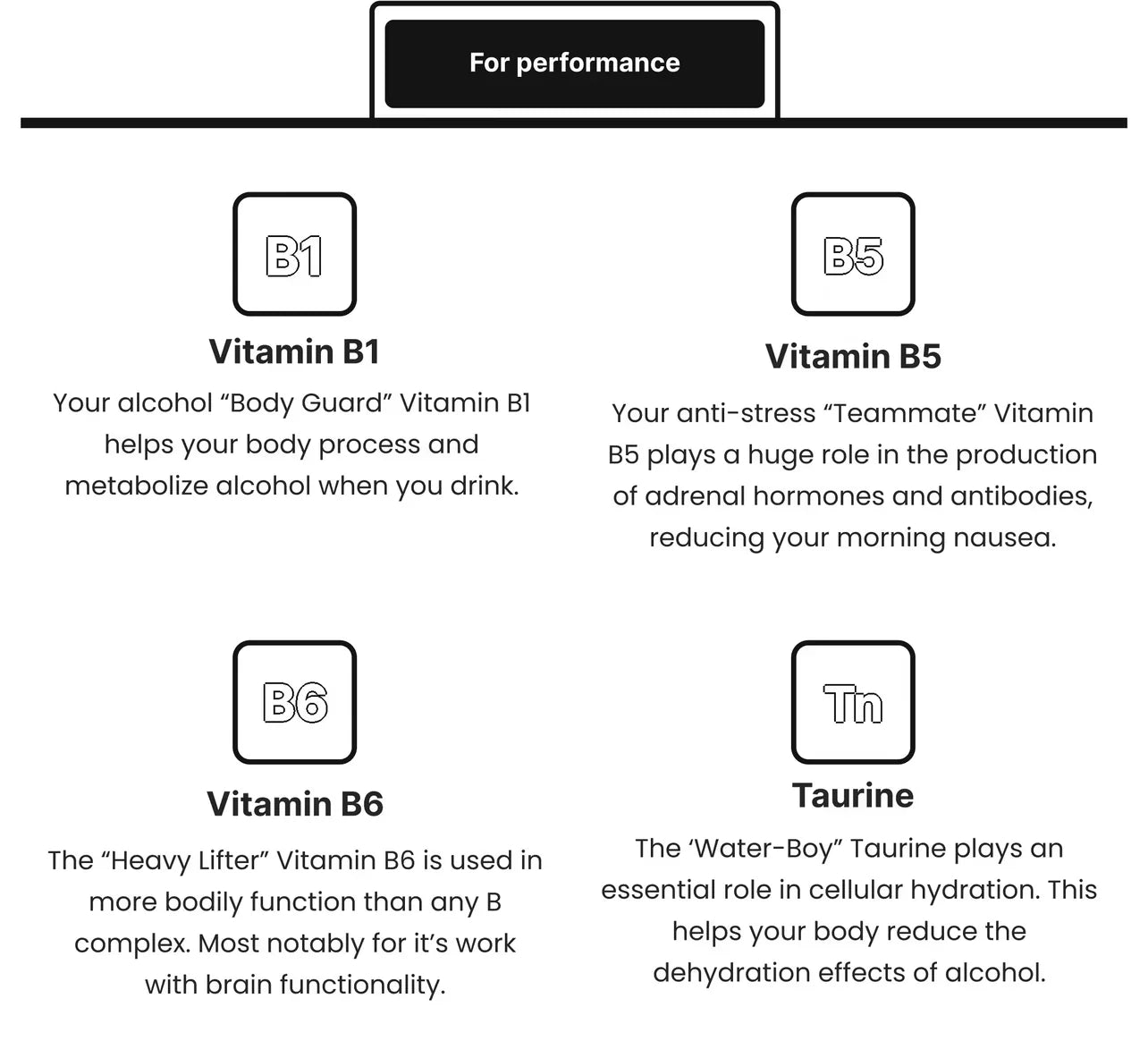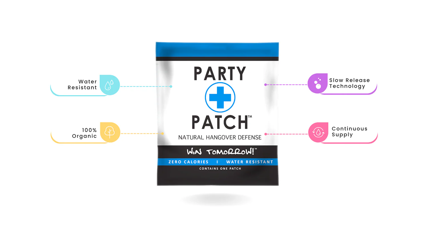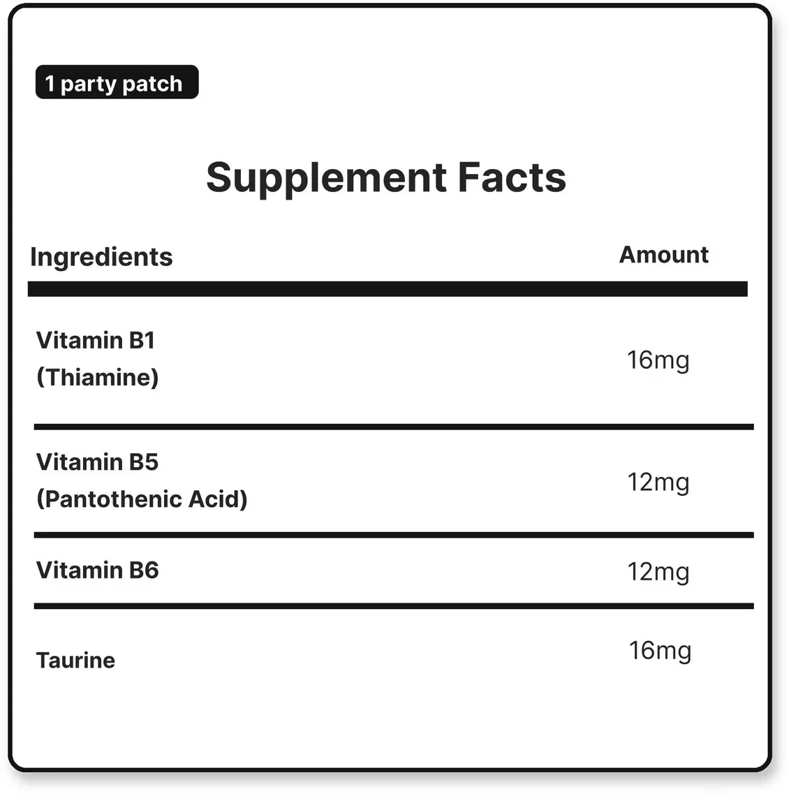 A patch designed to reduce your hangover. Our patches contain B vitamins (to process alcohol) and Taurine (to keep you hydrated). Just put a Party Patch on before you start drinking and take off the next morning (without the nasty hangover symptoms).