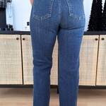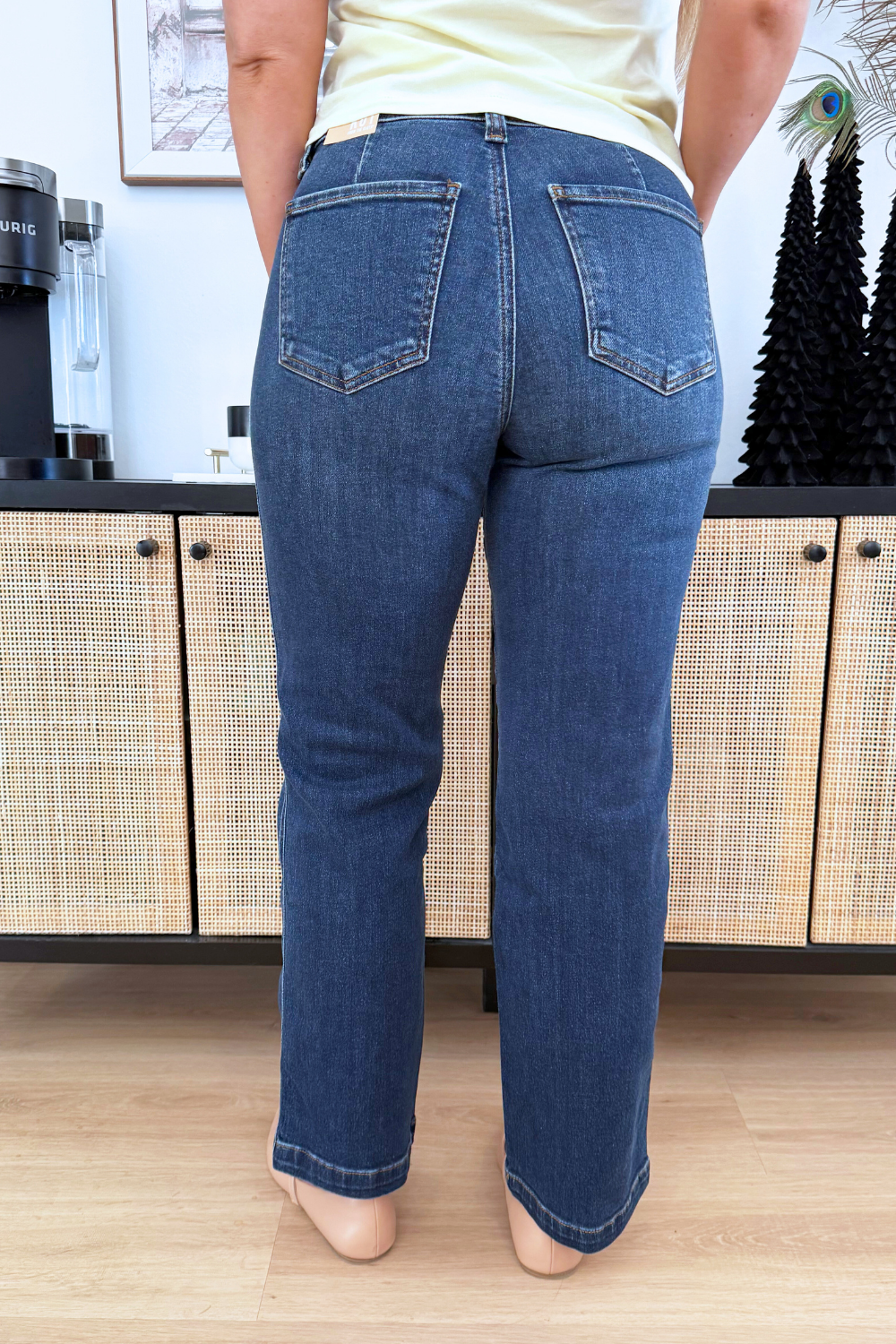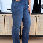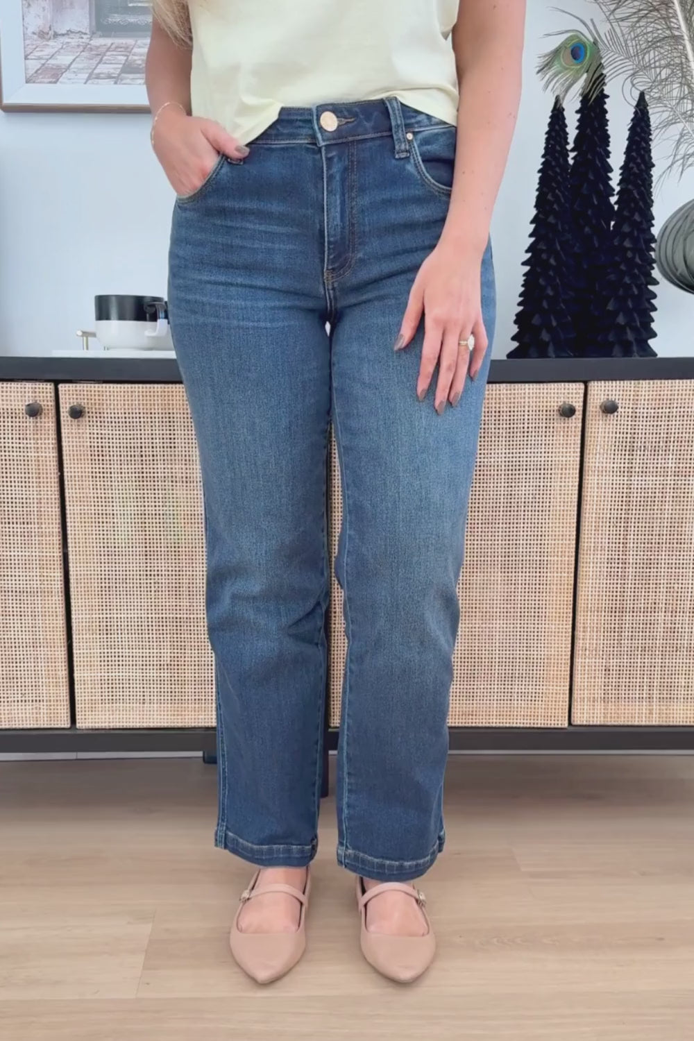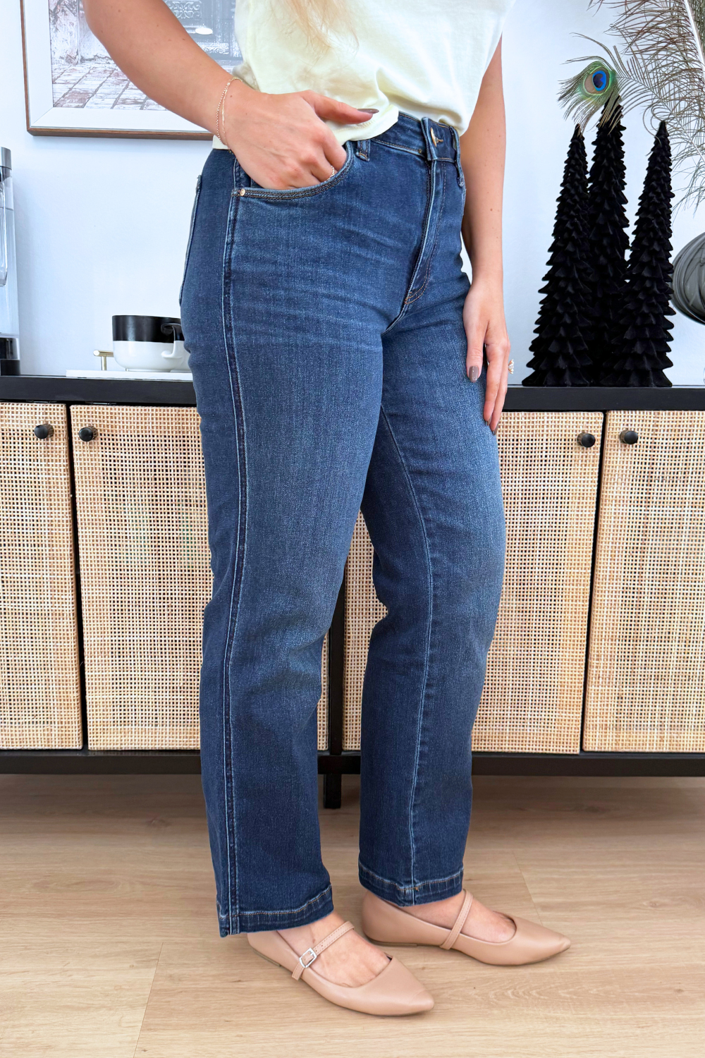 These high-rise straight leg jeans offer a flattering fit with a classic 5-pocket design and a rich dark wash finish. Made from very stretchy material, they provide all-day comfort without losing their shape. A perfect blend of style and ease, they’re your new go-to for any occasion!