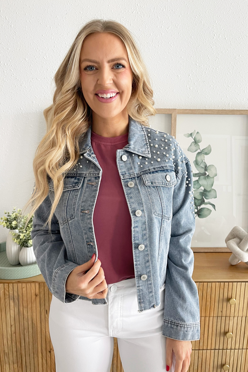 Can you have too many denim jackets – no! You need the Pearl Stud Denim Jacket with Raw Edge Hem in your closet. This cropped trucker jacket has a button front, raw edge hem, and chest pockets. The pearl rivet detail sets it apart from the other denim jackets in your closet. Add to cart now!