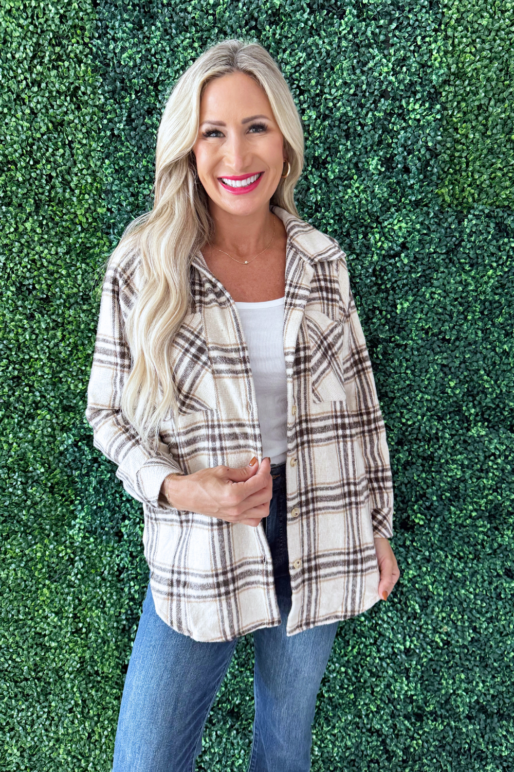 If you're needing a plaid shirt jacket for your fall wardrobe, this is the one for you! This style doesn't stray far from the classic featuring front and side pockets and a button front. This is a must-have for this fall!