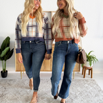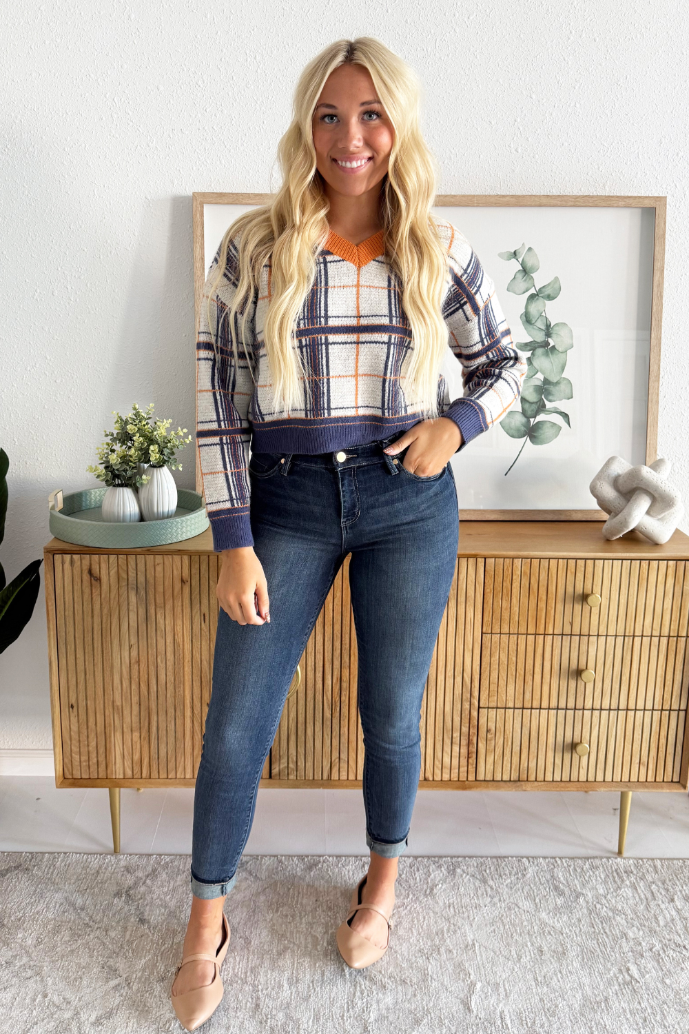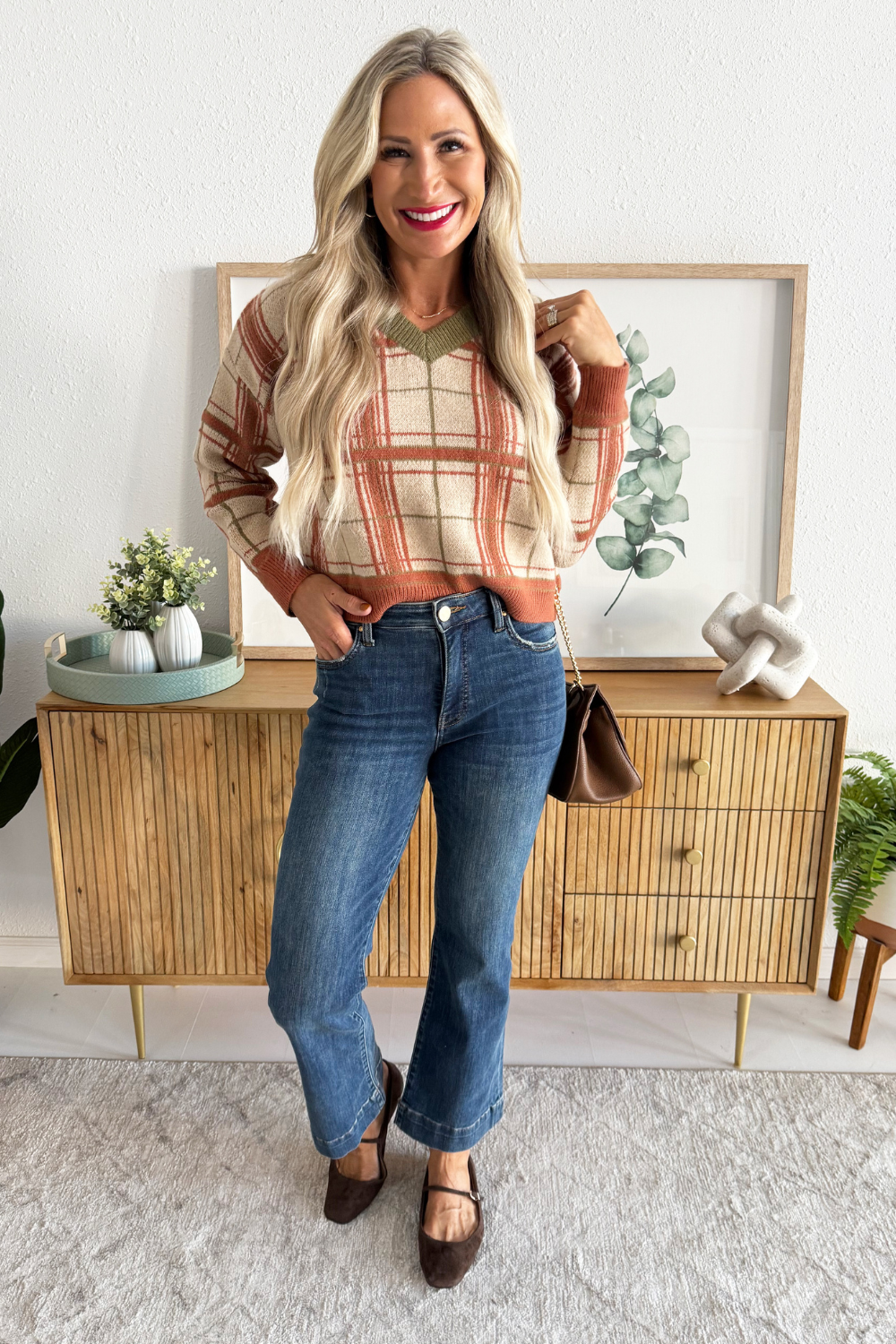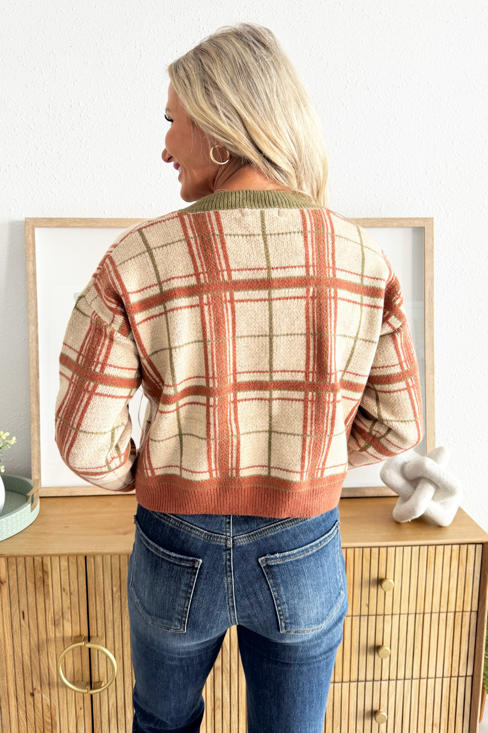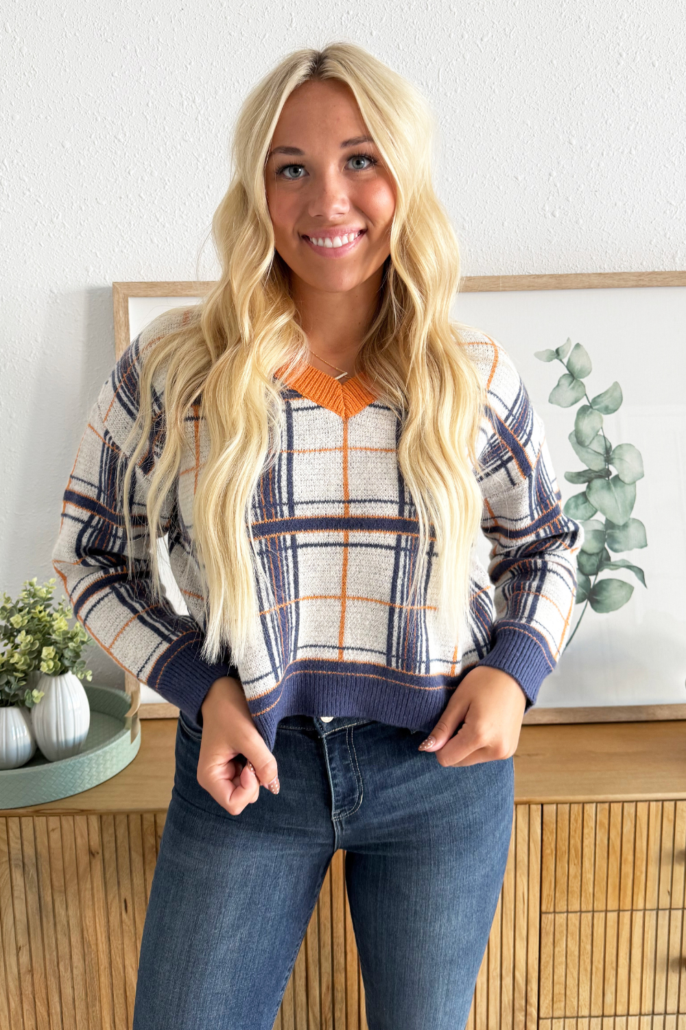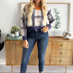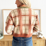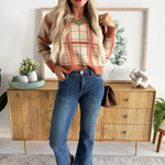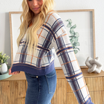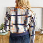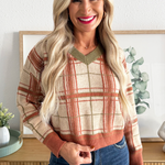 Jump into fall with this plaid knit sweater, featuring contrast neckline, cuffs, and hem as well as a flattering v-neckline. This top is a fall wardrobe must have with endless styling options! Pair back to denim, trousers, or skirts!