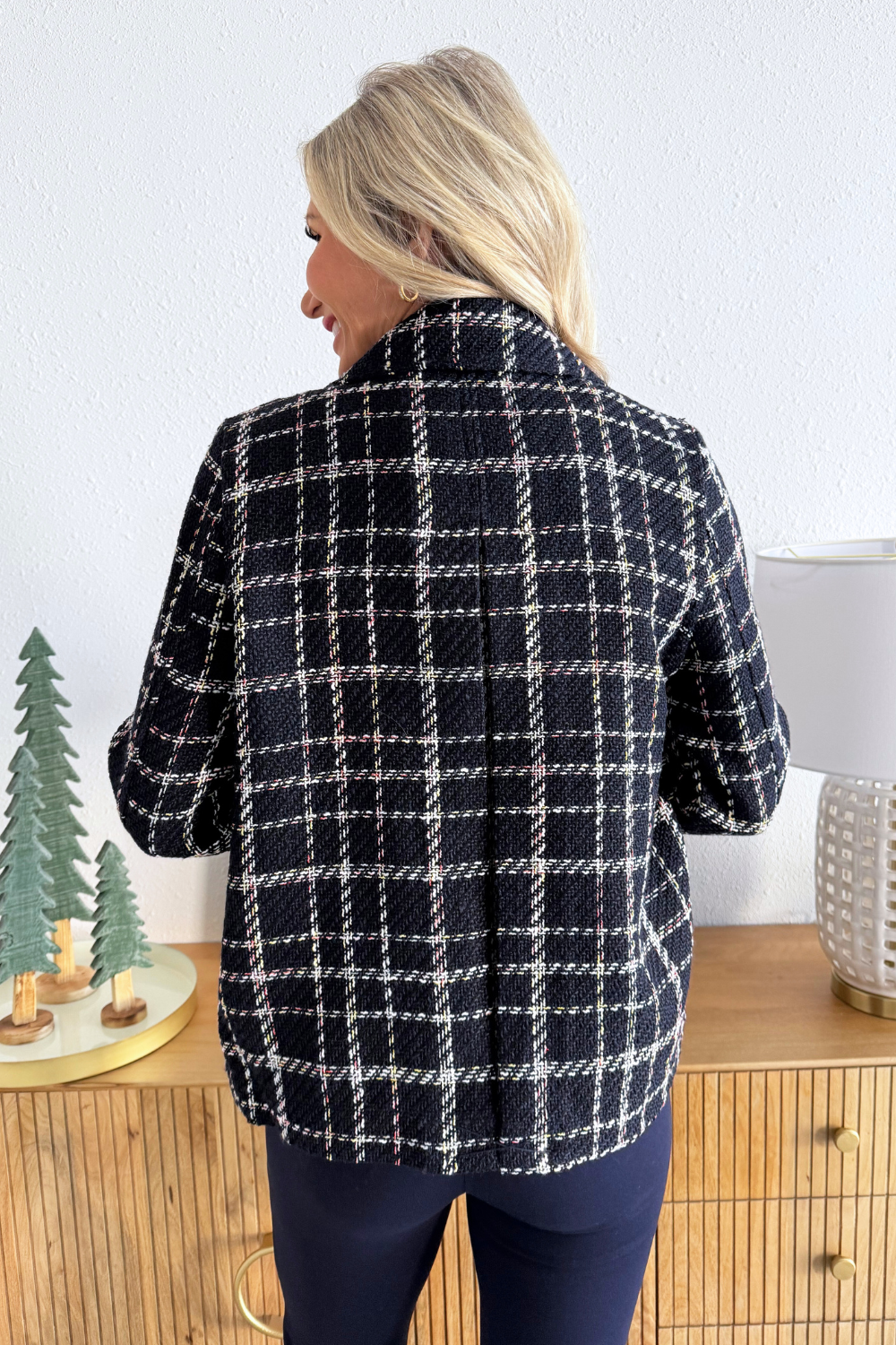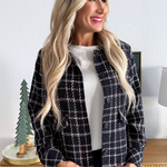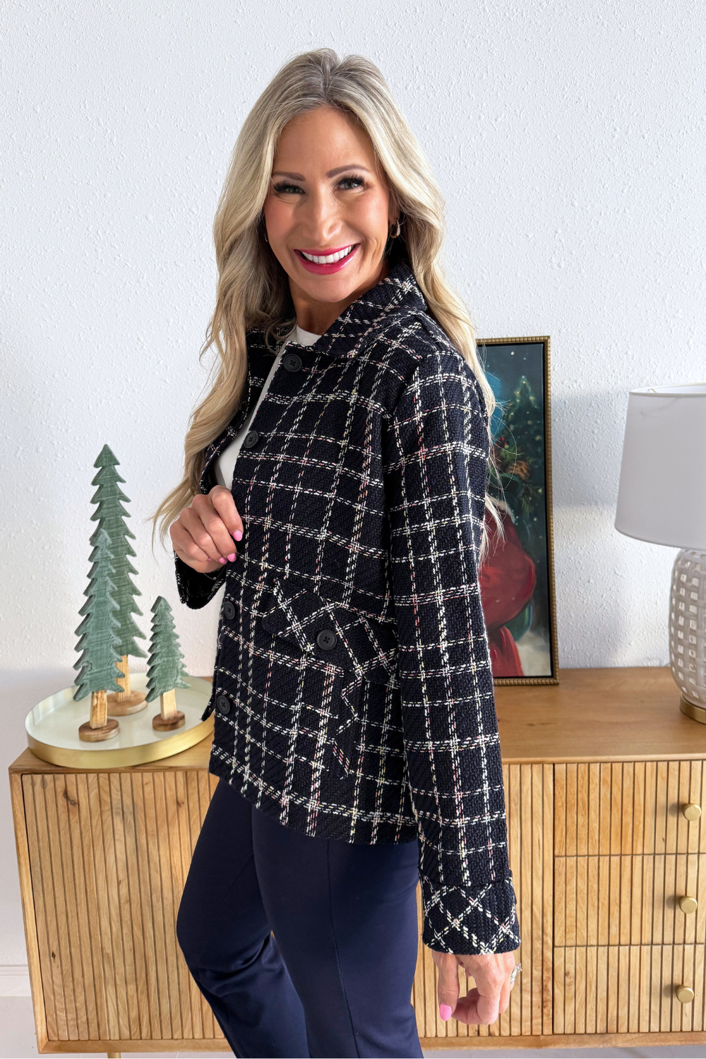 Add a touch of sophistication to your look with this pleated black jacket featuring a timeless plaid design. The structured pleats create a flattering silhouette, while the plaid detailing adds a chic, classic touch. Perfect for layering, it effortlessly combines modern style with refined elegance!