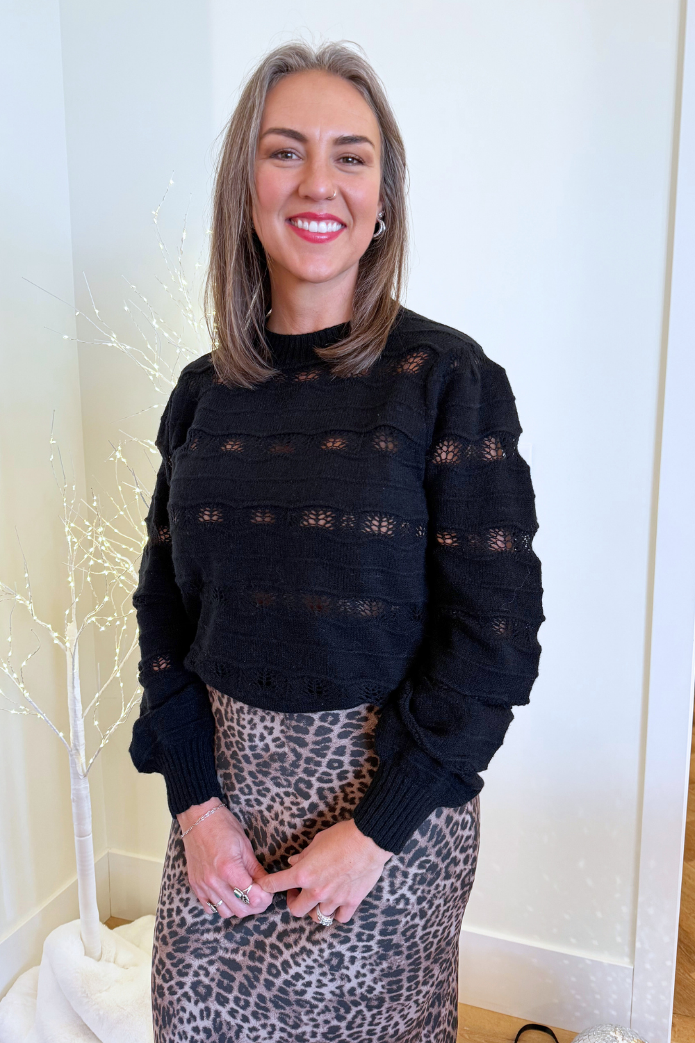 This pointelle stripe knit pullover blends cozy texture with delicate detail. The airy pointelle stitching creates subtle stripes, adding dimension and a touch of elegance to the classic silhouette. Perfect for layering under a jacket or wearing on its own with your favorite denim!