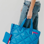 Meet your new go-to, fashionable, carry all bag - Our new Presley Puffer Quilted Tote Bag! This tote is perfect to wear all year round and features our signature 3 sister studs, a front exterior zipper pocket with a coordinating color zipper lining, one interior zipper pocket, two interior open pockets, and a matching pouch attached to a pouch leash. Available in 7 colors, this tote will elevate all your looks while keeping you practical and ready for the day!