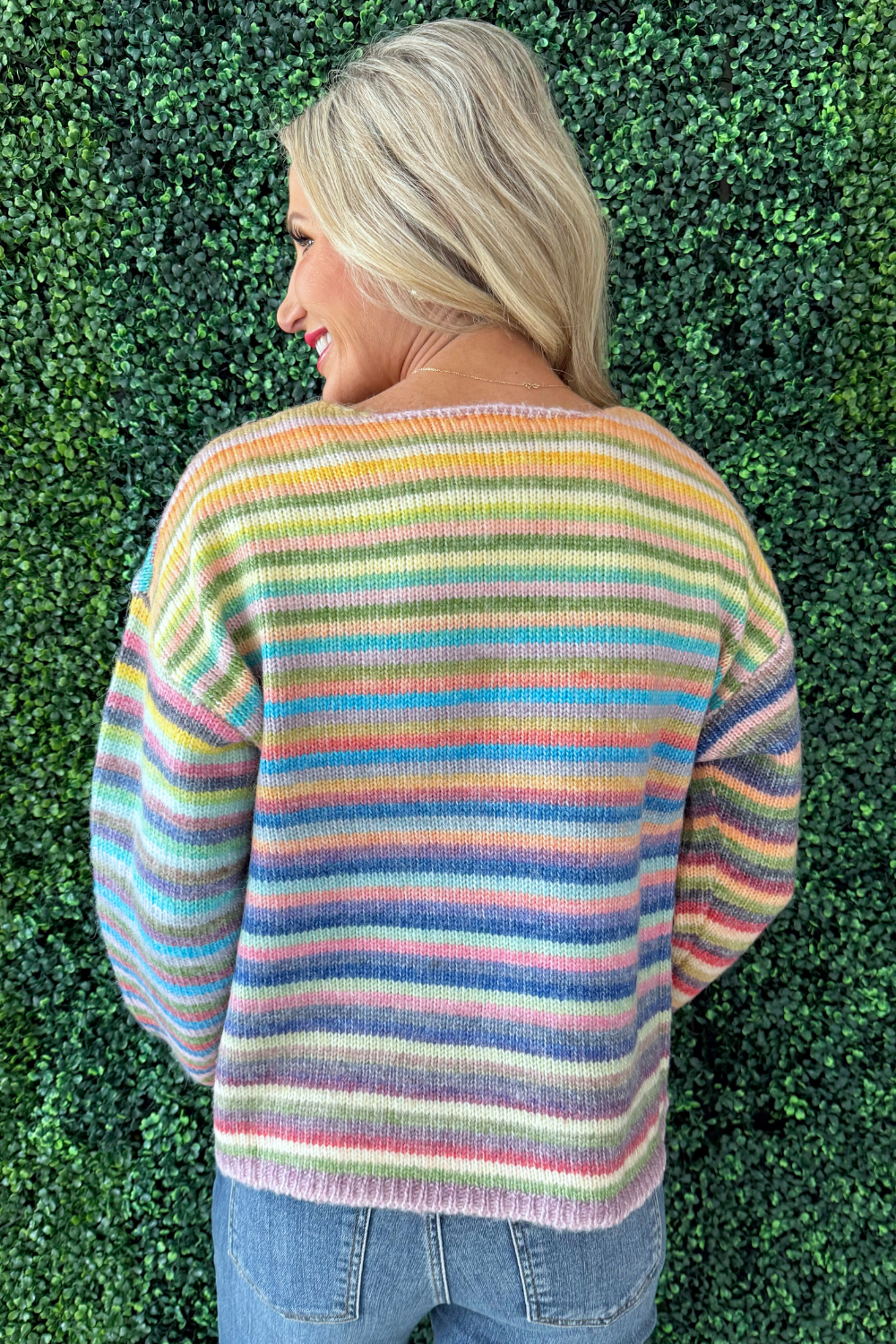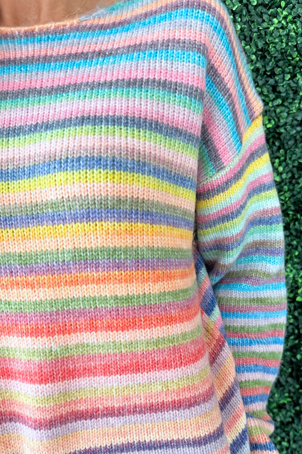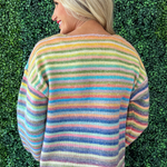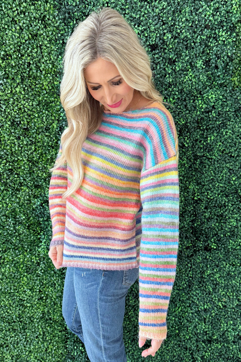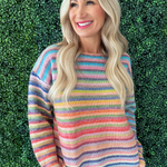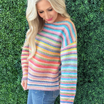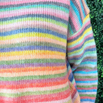This rainbow knit sweater brings playful color and cozy comfort to your wardrobe. Featuring soft, vibrant stripes and a relaxed fit, it’s perfect for brightening up everyday outfits. Fun, cheerful, and easy to wear, it’s a standout piece for any look!