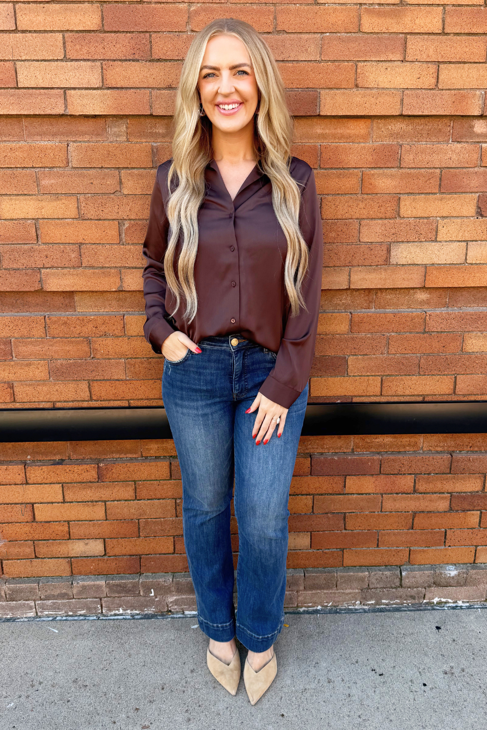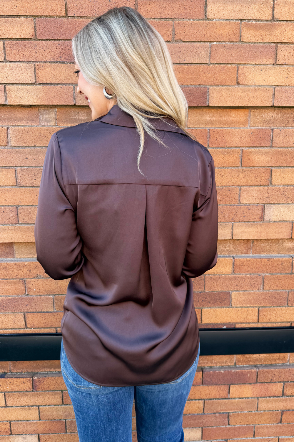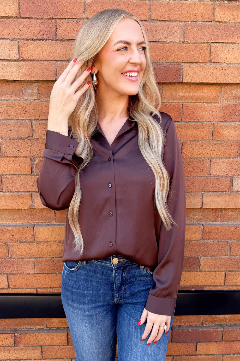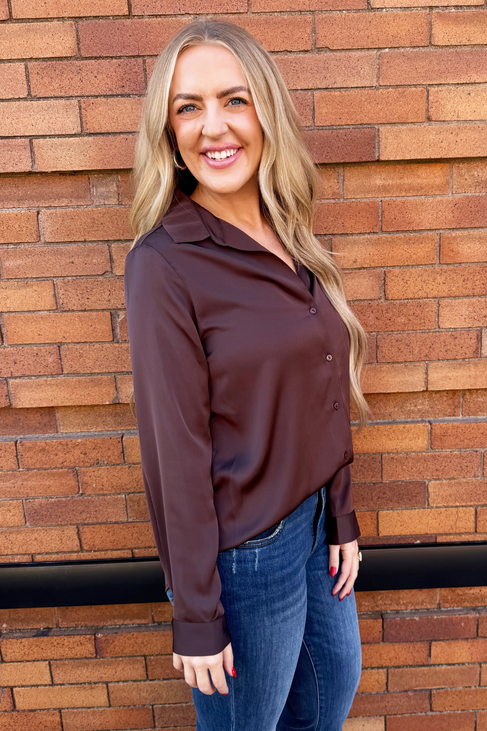Elevate your wardrobe with this elegant satin button-down blouse, featuring a silky-smooth finish and a flattering drape. Its classic collar and subtle sheen make it perfect for both polished daytime looks and sophisticated evening events!