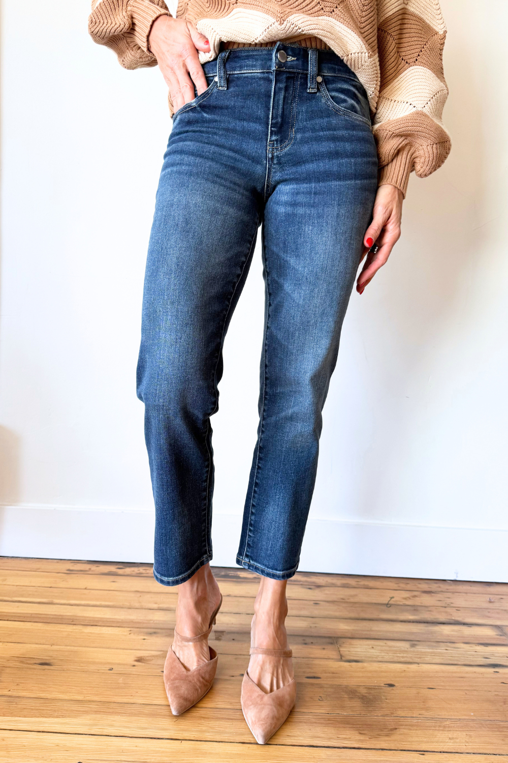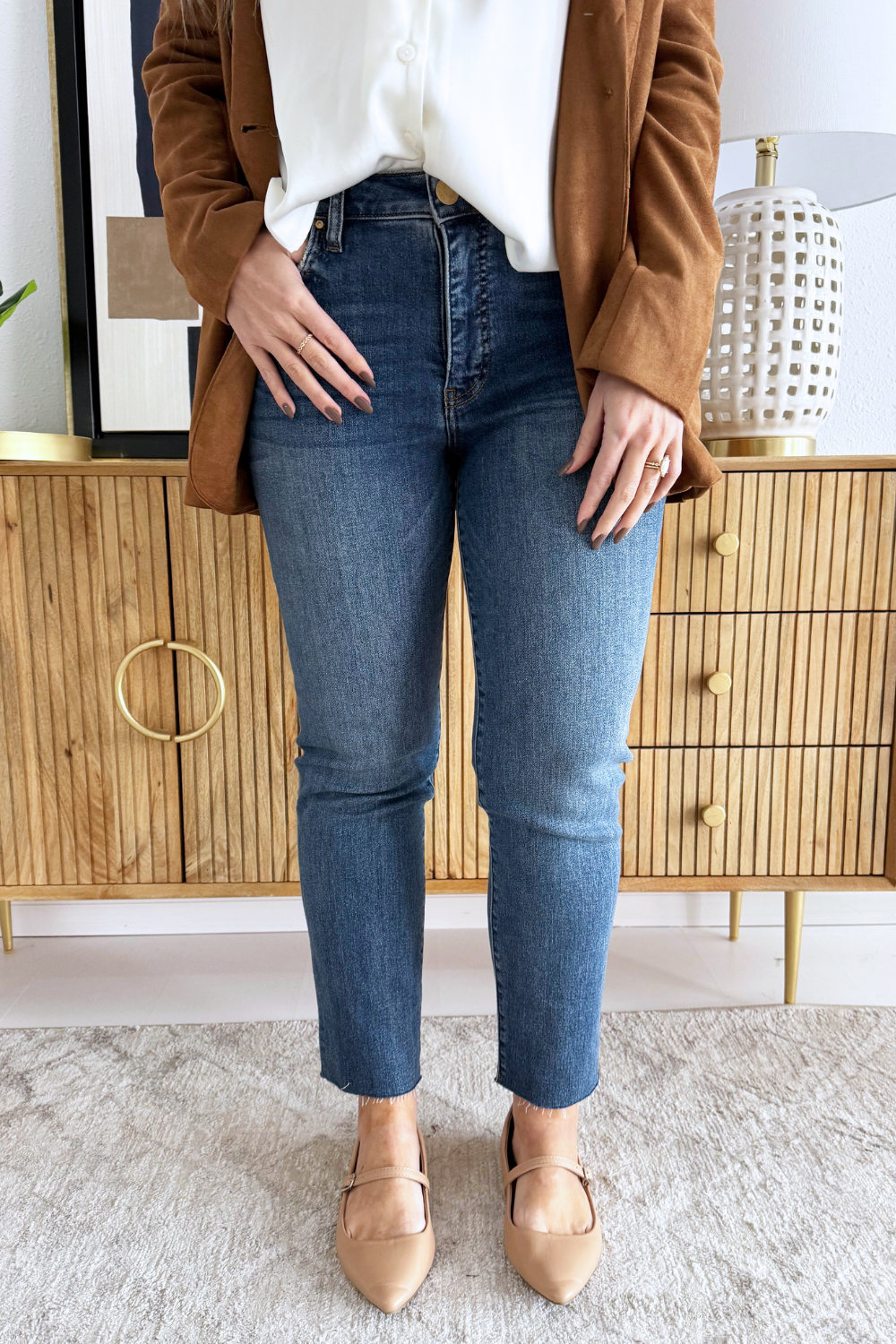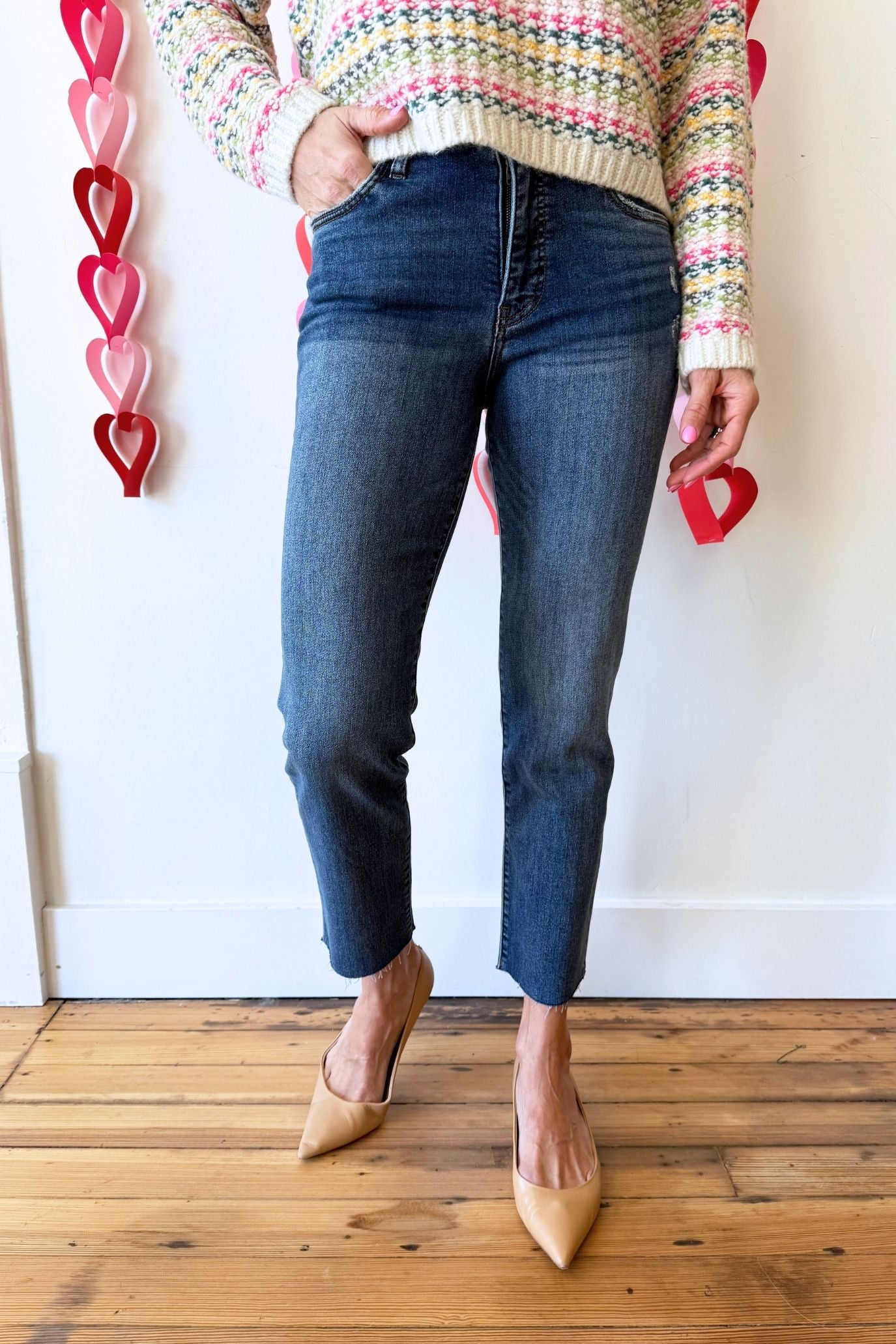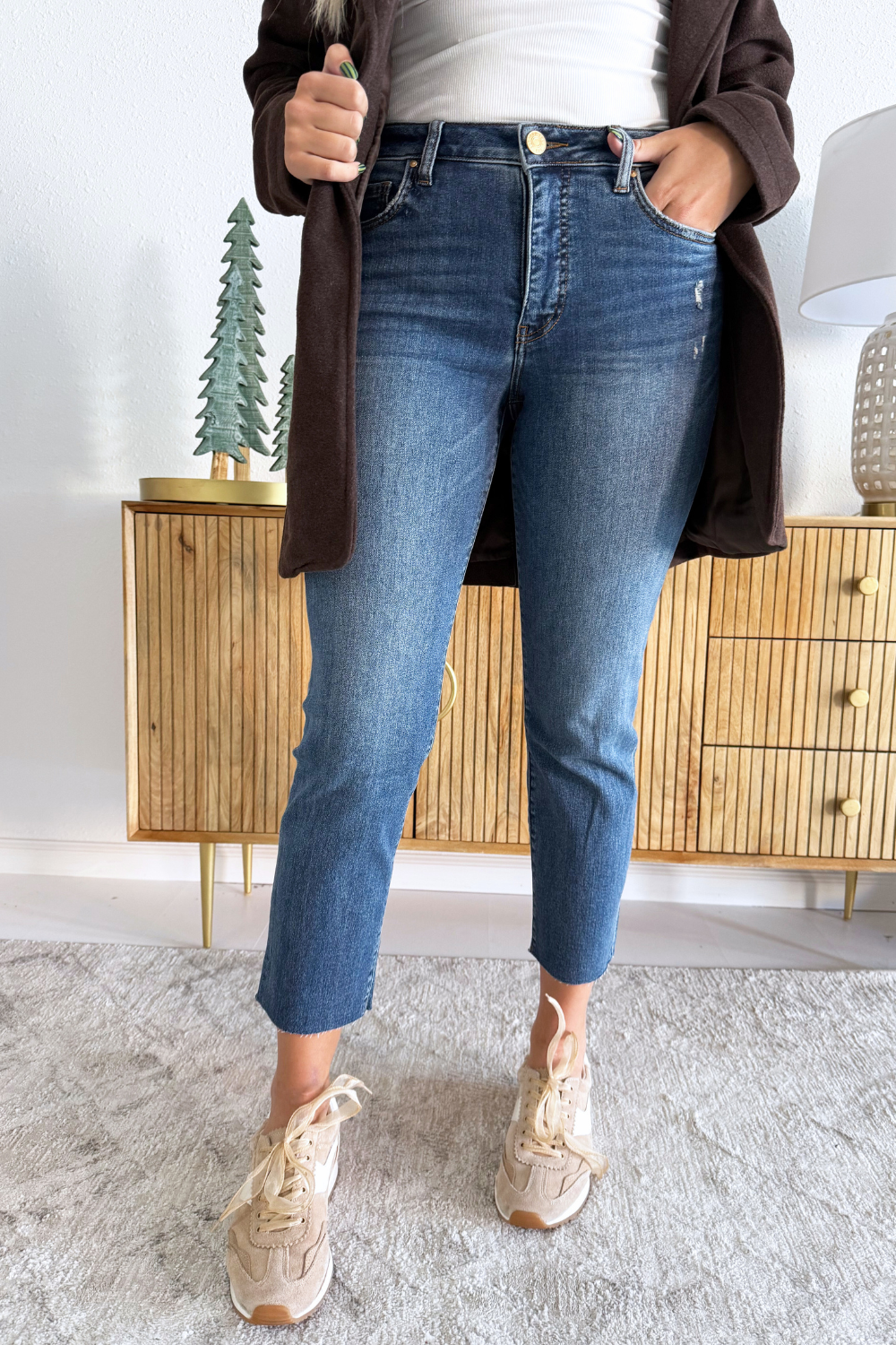 Step into effortless cool with these high-rise ankle straight jeans! Featuring Fab Ab for a flattering fit, a trendy raw hem, and a touch of distressing, they're made from a stretchy material for comfortable all-day wear. Perfect for casual looks with an edge!
