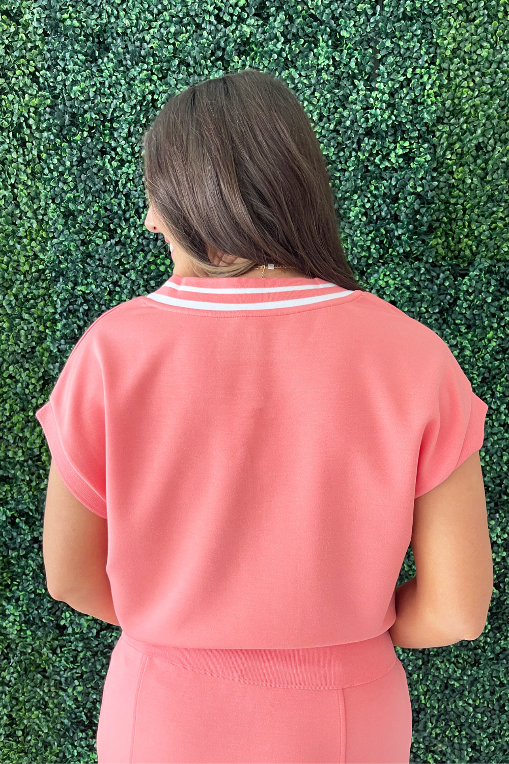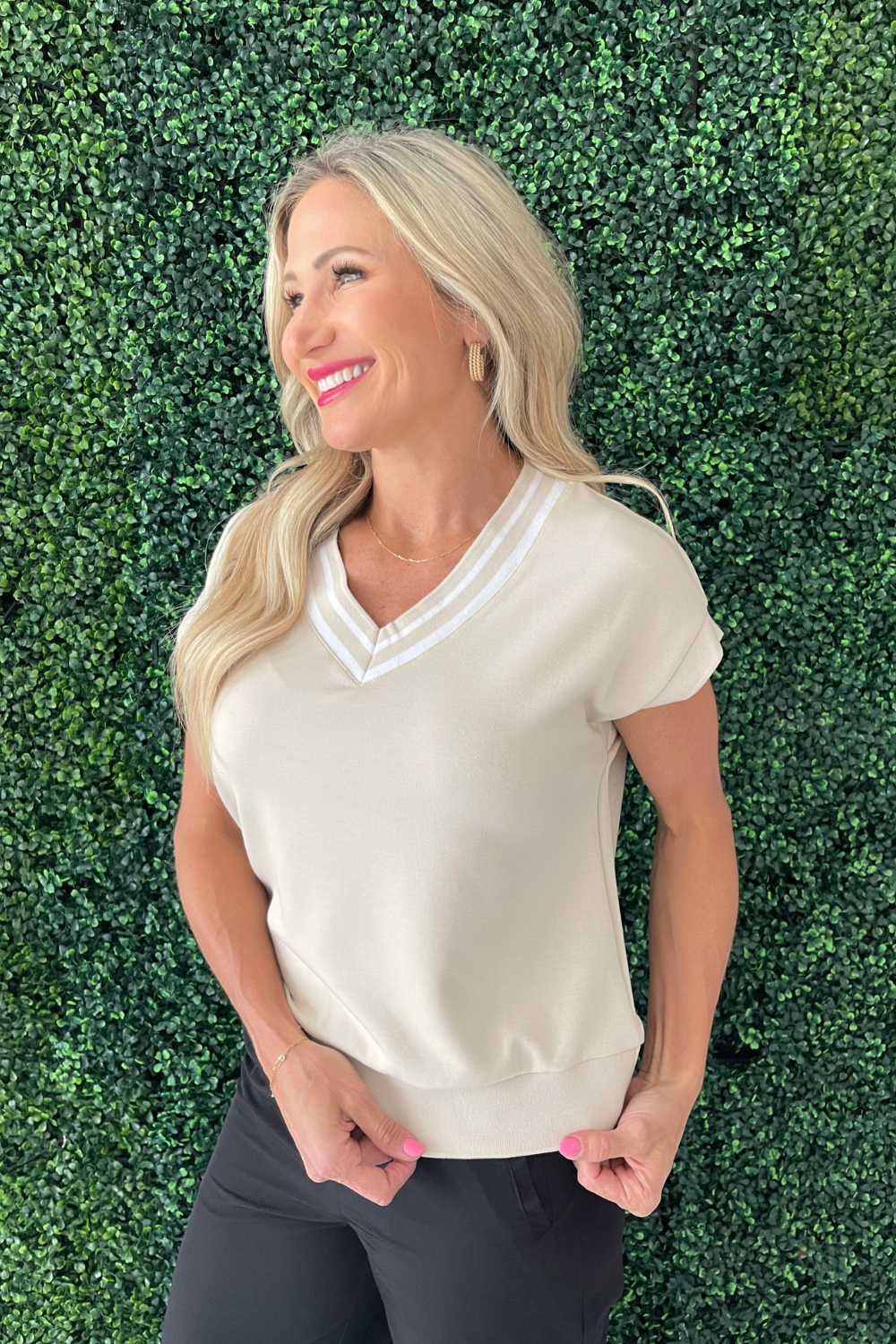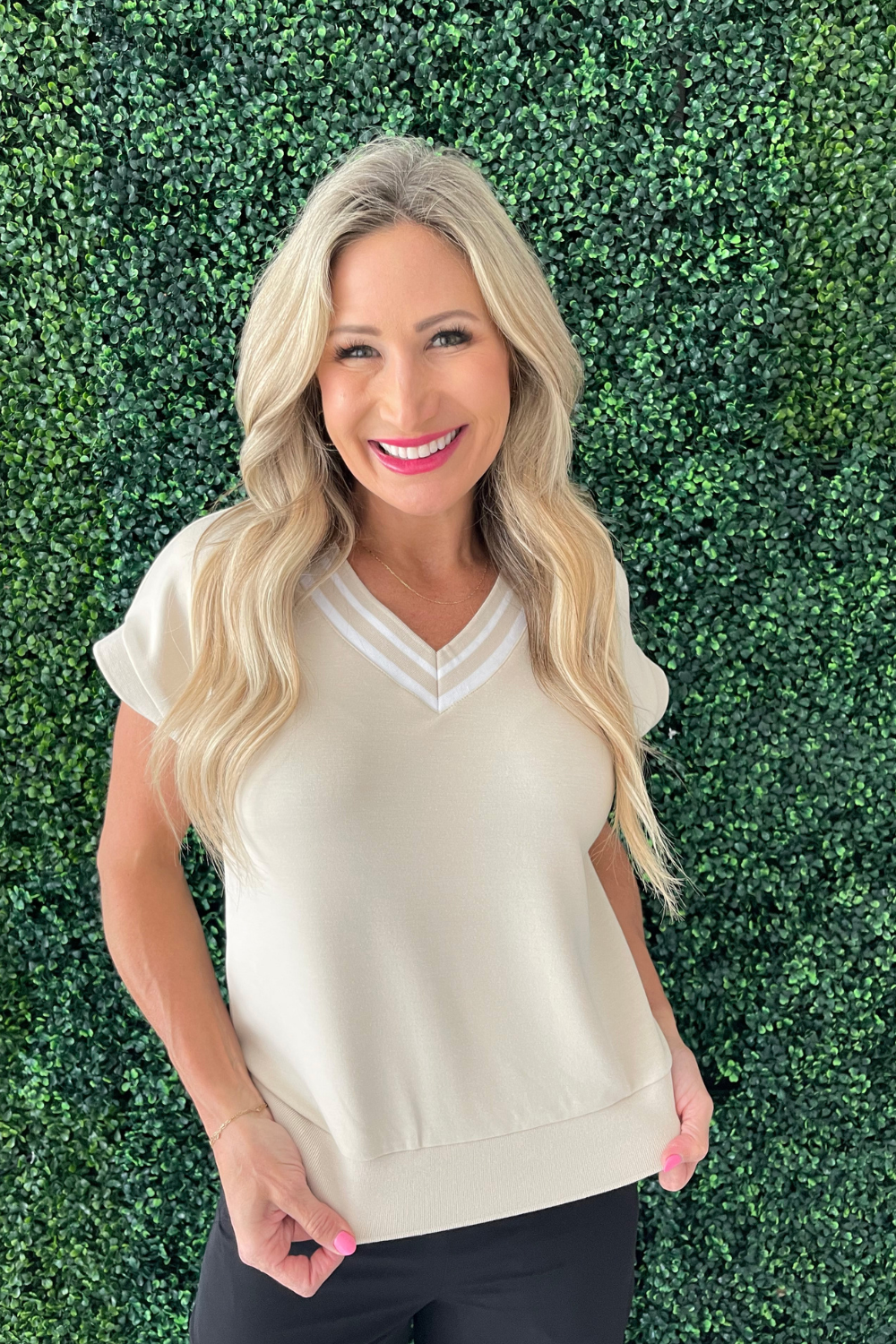 The Rhonda Top from Thread & Supply is perfect for casual days. This short sleeve top has a V neck, Dolman sleeves, and banded cuff and hem. The stripe detail at the neckline adds a sporty vibe to this super soft top. Wear it jeans or denim for an easy casual outfit.