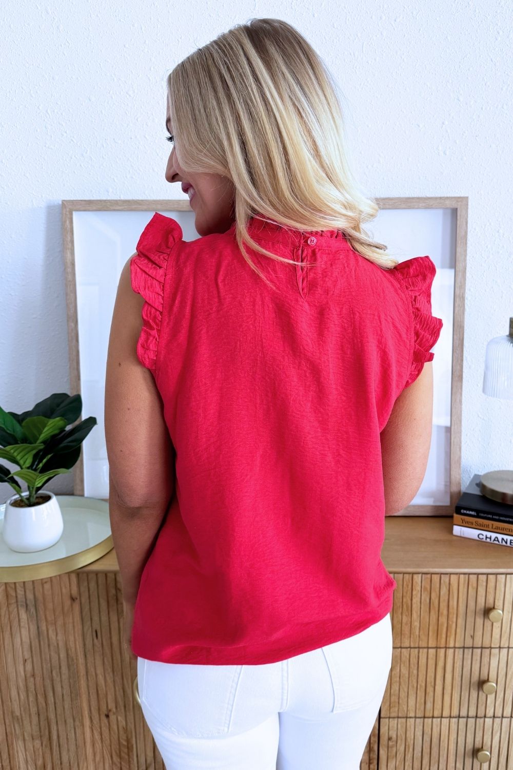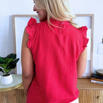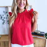 The Ruffle Sleeve Keyhole Back Blouse is a bright and feminine top that adds a polished touch to any outfit. Featuring soft ruffle sleeves and a gathered neckline, this blouse is finished with a keyhole back detail for an elevated look. Lightweight and easy to style, it pairs perfectly with denim or dressy bottoms.