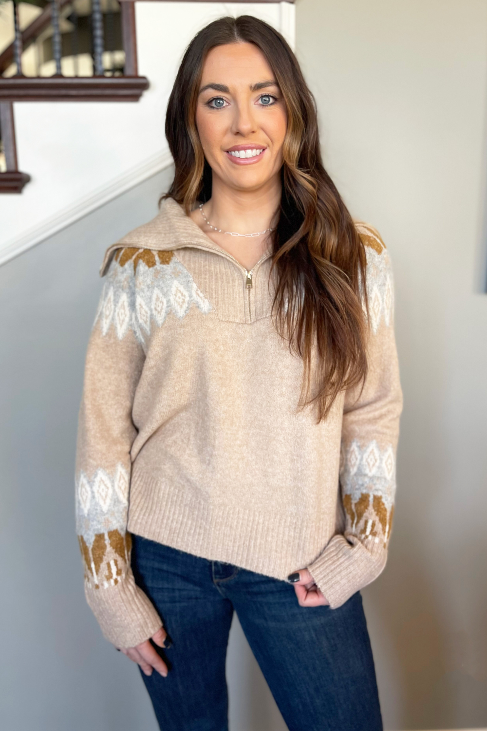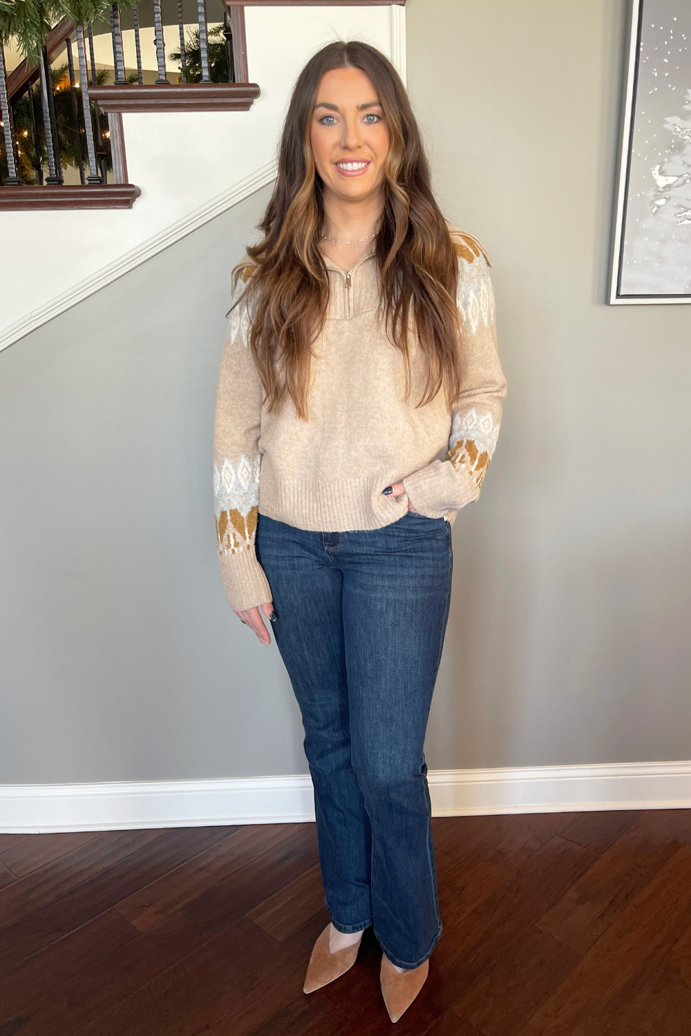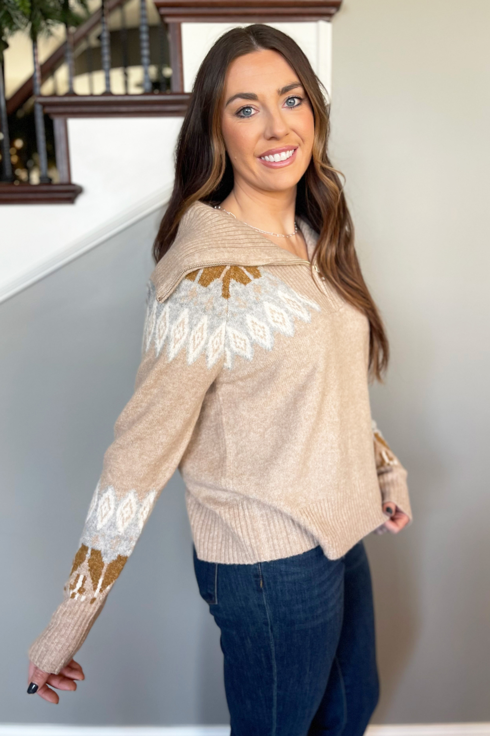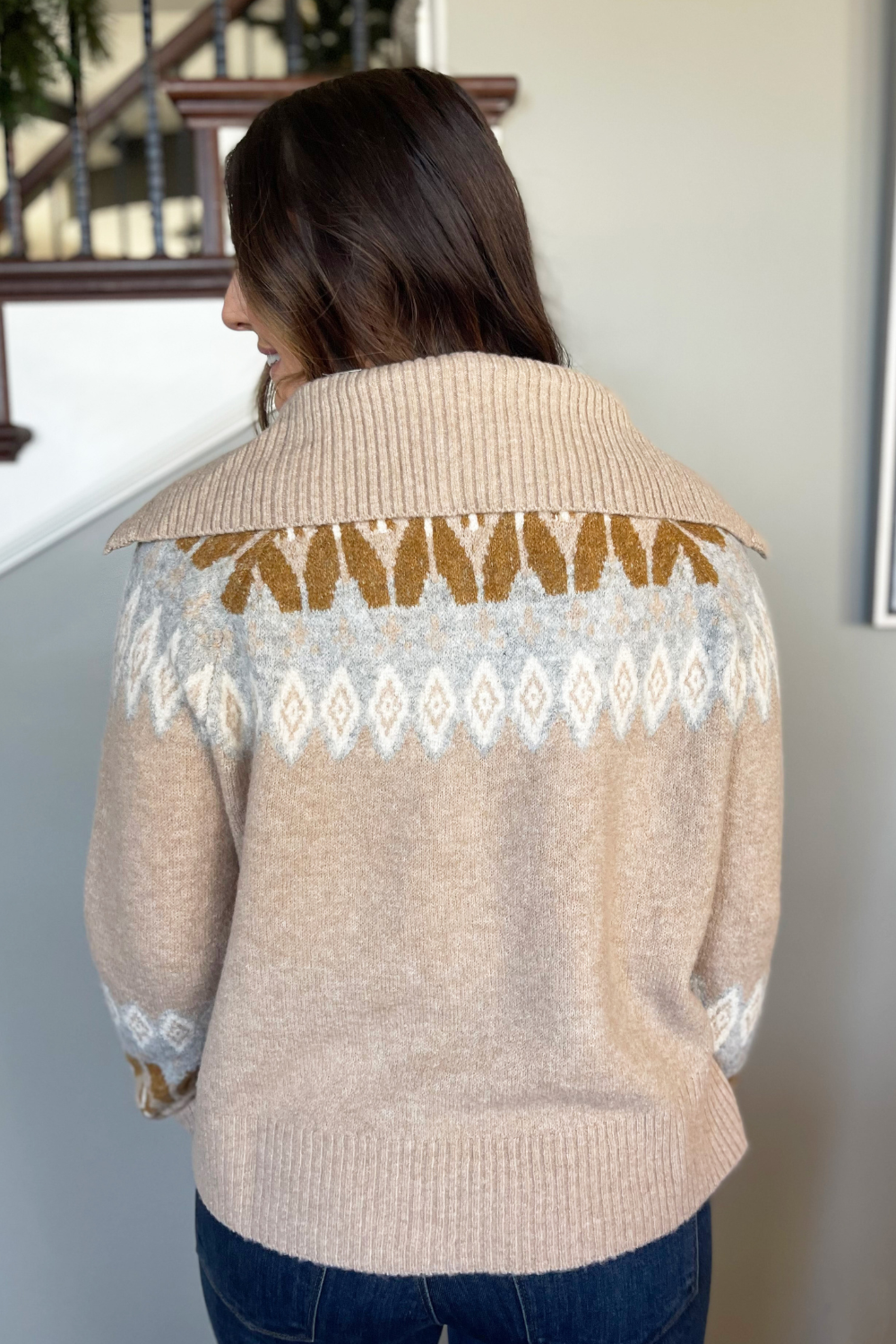 You will love the unique look of the Sailor Collar Ethnic Motif Sweater. The sweater has a fun sailor collar and an ethnic motif in an easy to wear neutral color pallet. Pair this top with your favorite denim and sneakers for a fresh casual look.