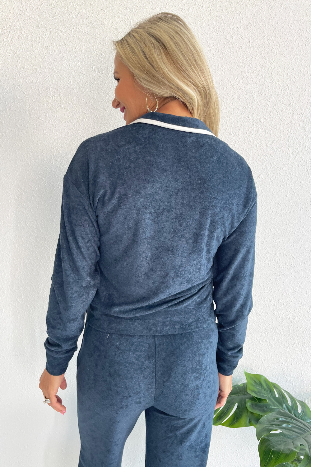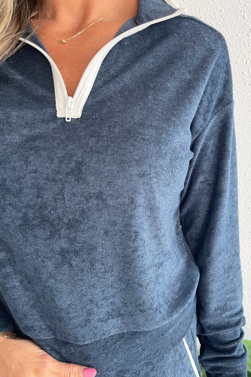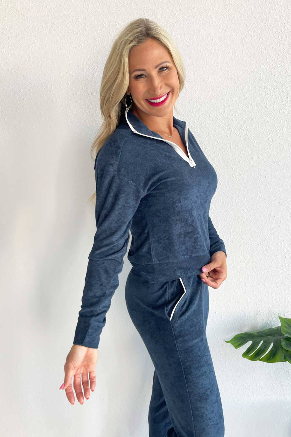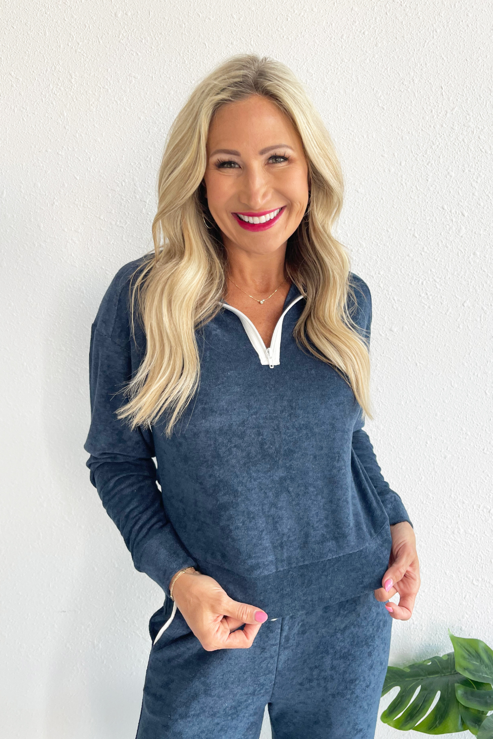 The Sharon Pullover from Thread & Supply is cozy and unique. This long sleeve pullover has a mock neck, half zip front with contrasting trim, and banded cuffs and hem. It is made with soft, lightweight fleece with a crushed effect. Wear it with the Sharon Joggers for a matching set.