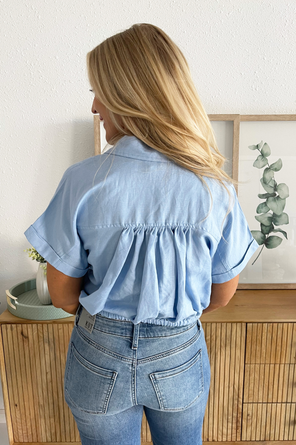 The Short Sleeve Button Up Tie Front Shirt is great for warm weather. This short sleeve collared shirt has a snap front closure and flattering drawstring waist. This top pairs perfectly with denim or shorts for an easy casual look.