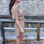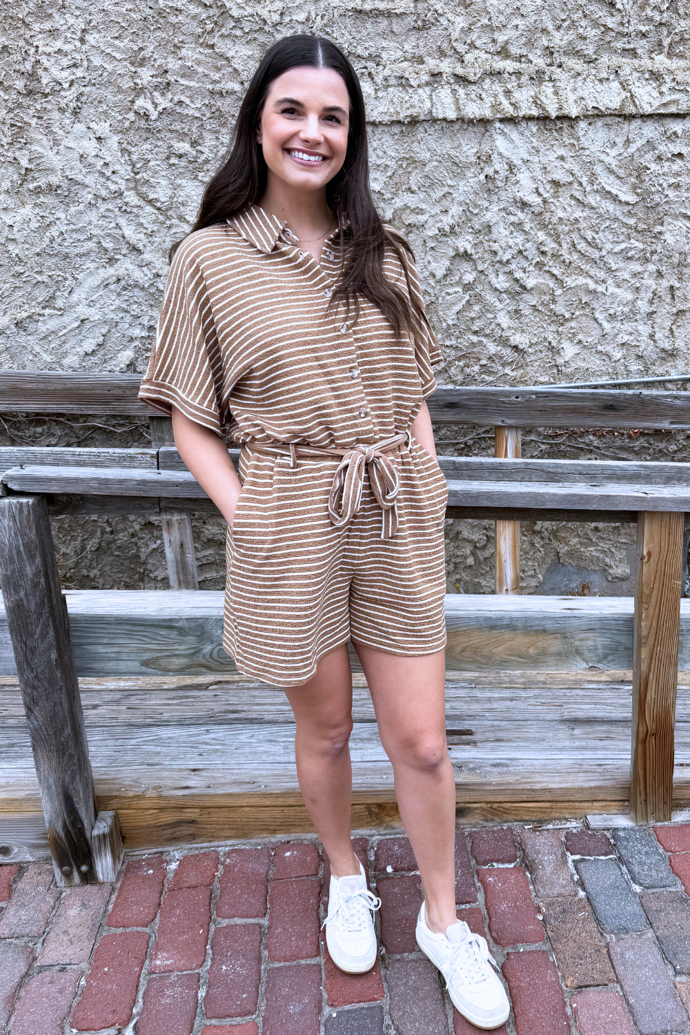 Short Sleeve Button Up Tie Waist Romper This short sleeve romper features a classic button up front with a flattering tie waist that creates an easy, defined silhouette. The lightweight fabric and relaxed fit make it comfortable for everyday wear while still looking polished. It’s a versatile piece that can be styled casually with sandals or dressed up with wedges for a more elevated look.