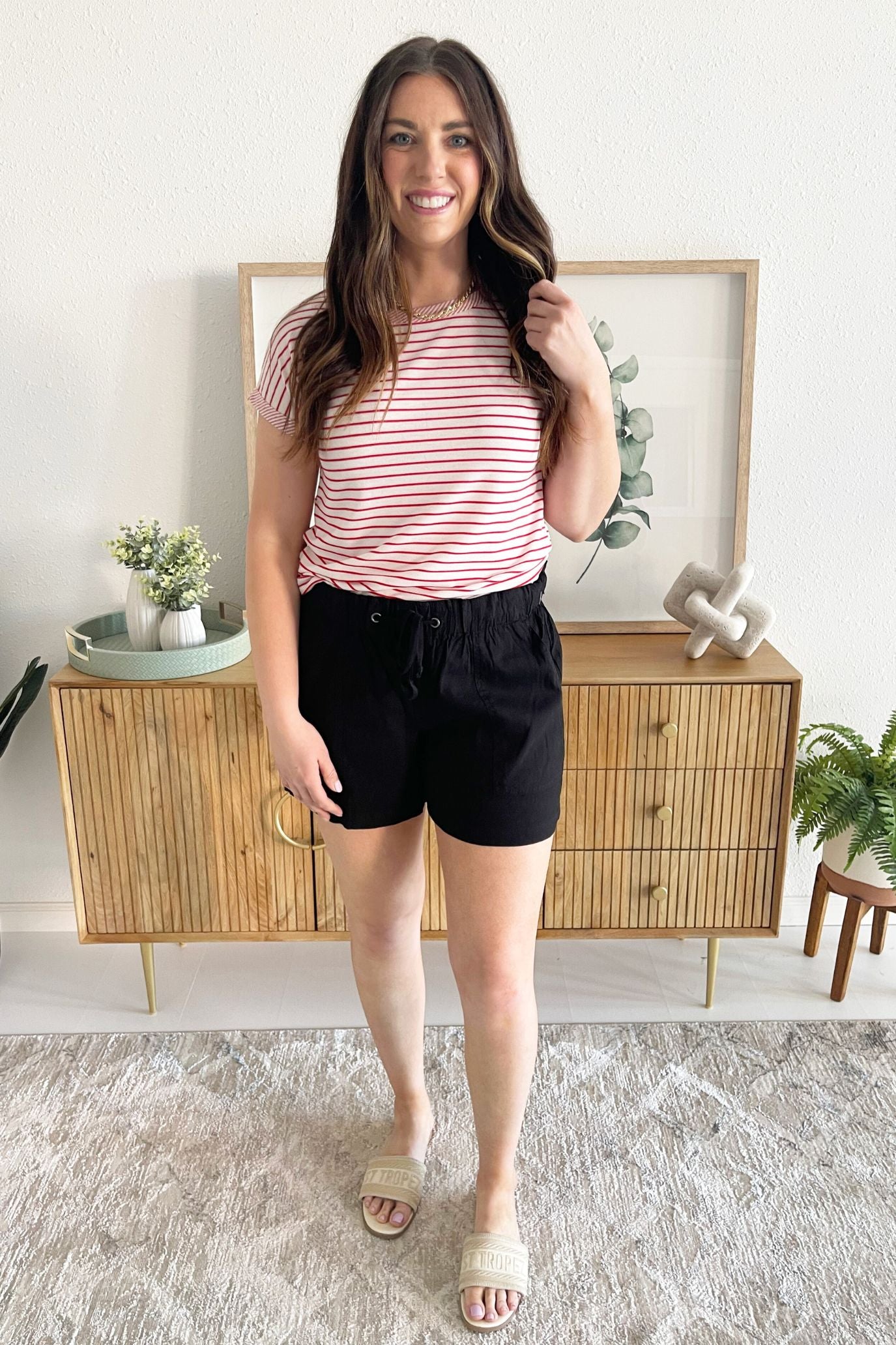 The Short Sleeve Pinstripe Crew Neck Top is a warm weather staple. This crew neck top has short sleeves, striped design, and a contrasting trim at the neck and arm openings. Add shorts and sandals for an easy casual look.
