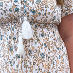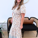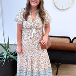 Short Sleeve V-Neck Midi Dress — This feminine midi dress features a flattering V-neckline and soft short sleeves for an effortlessly elegant look. The flowy silhouette and delicate print create a light, airy feel that’s perfect for spring and summer occasions. Easy to dress up with heels or keep casual with sandals, it’s a versatile piece for any wardrobe.