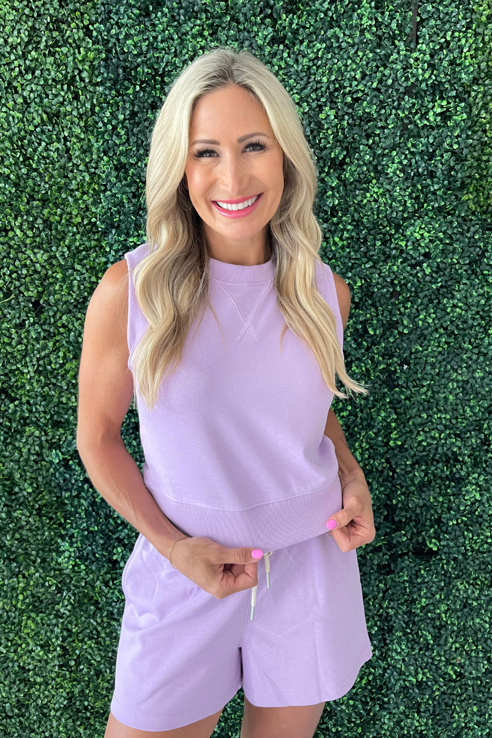 The Sleeveless Knit Top Set is perfect for casual days. This sleeveless top has a crewneck and banded hem. Wear it with the Ruffle Waistband Short Set shorts for a matching set.