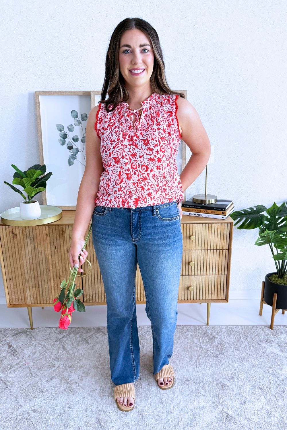 The Sleeveless Printed Top with Lace Trim Detail is a feminine and easy-to-wear piece perfect for everyday styling. Featuring a soft printed fabric with delicate lace trim accents, this top offers a lightweight feel and a flattering silhouette. Pair it with denim or shorts for a simple, put-together look.