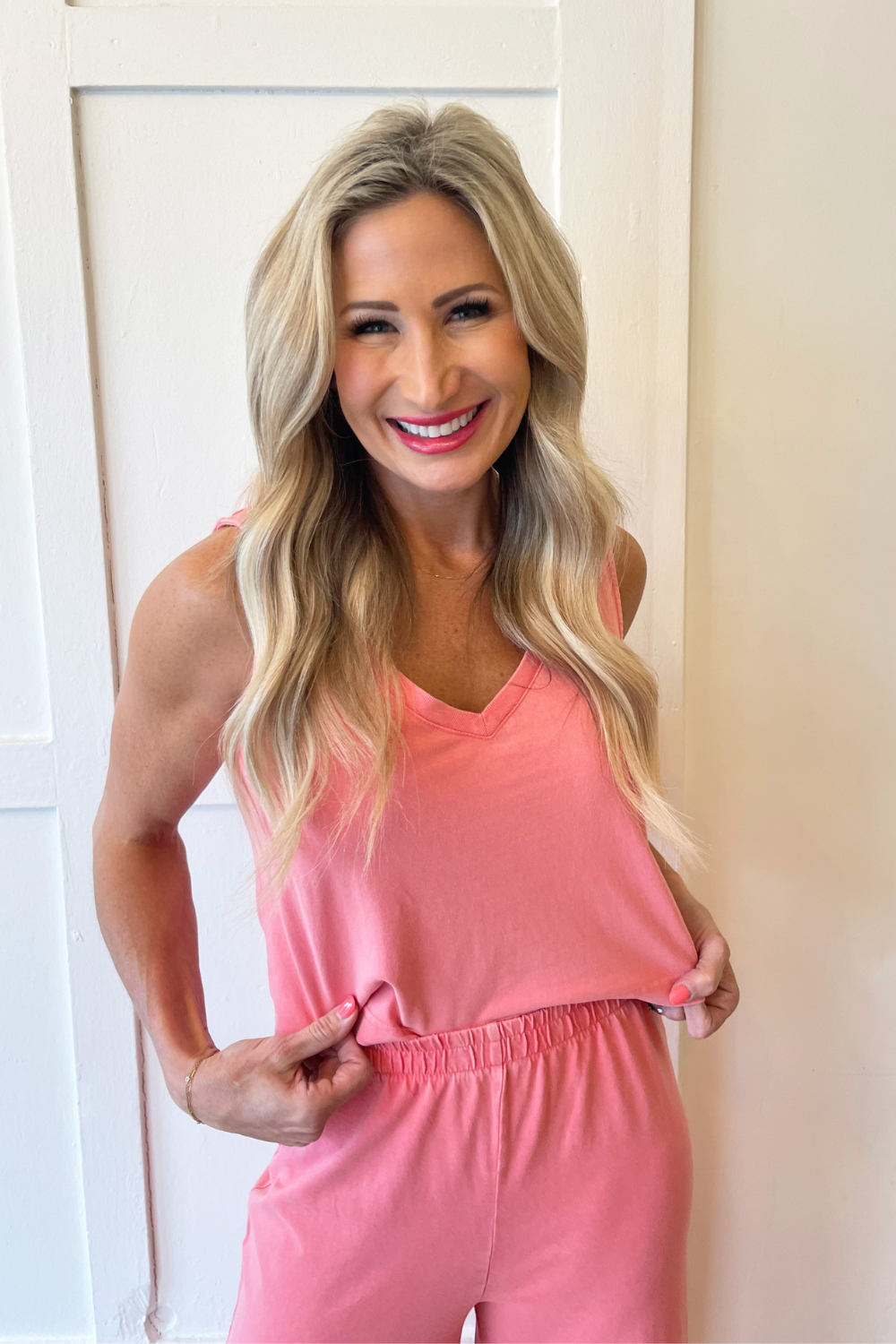- Jordan is 5'4" and wears size Small/4 (Sunset Pink)