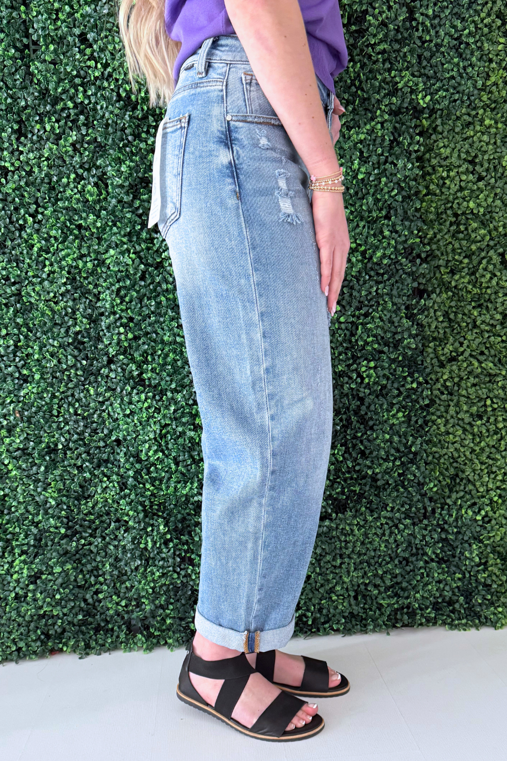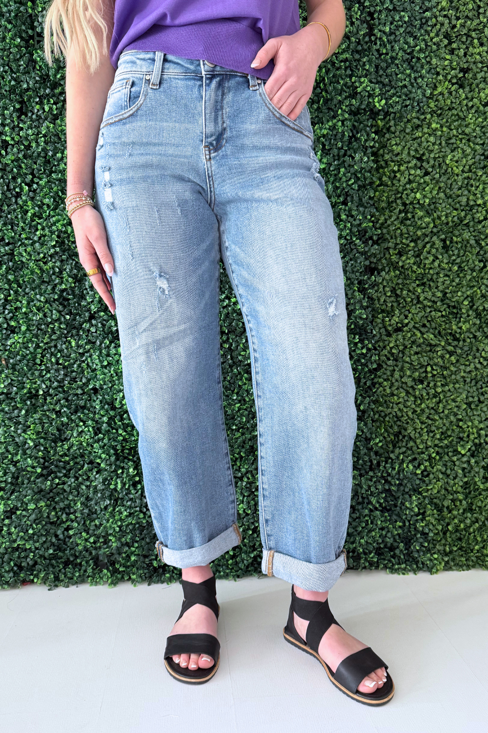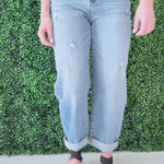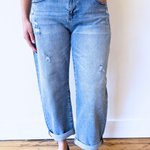 The Slouchy Ankle Length Barrel Jeans with Cuffs feature a relaxed silhouette with a modern barrel shape for an effortlessly cool look. Designed with a 10 1/2” rise and a versatile cuffed hem, this pair can be worn cuffed or uncuffed depending on your styling preference. The ankle-length cut and soft stretch blend provide structure with comfortable flexibility, making them an easy go-to for everyday wear.
