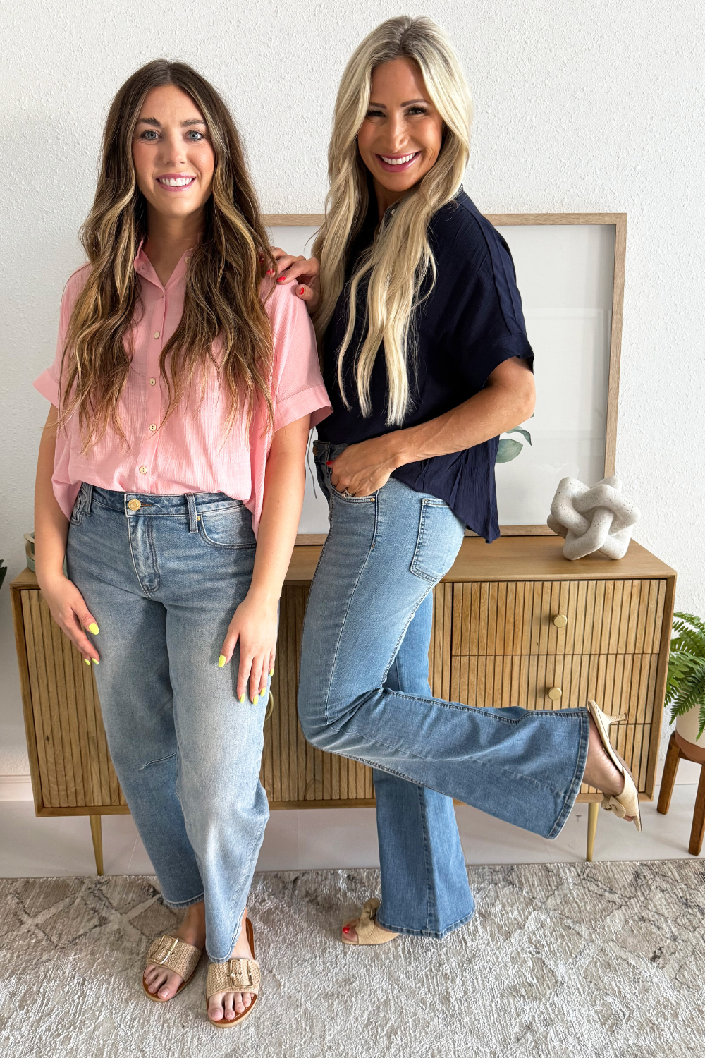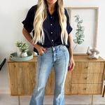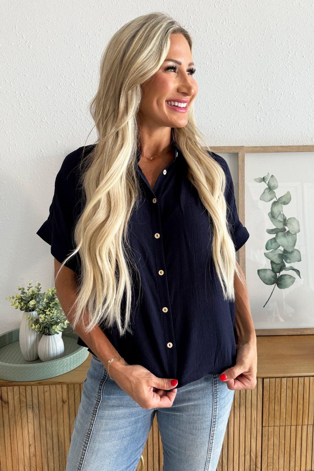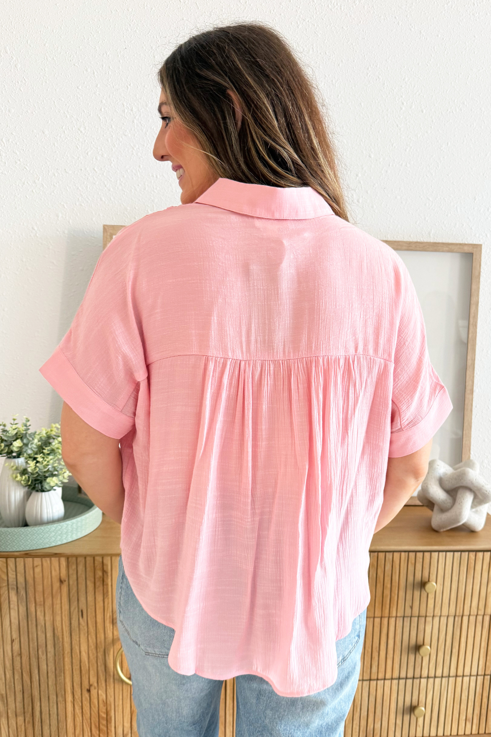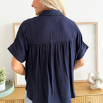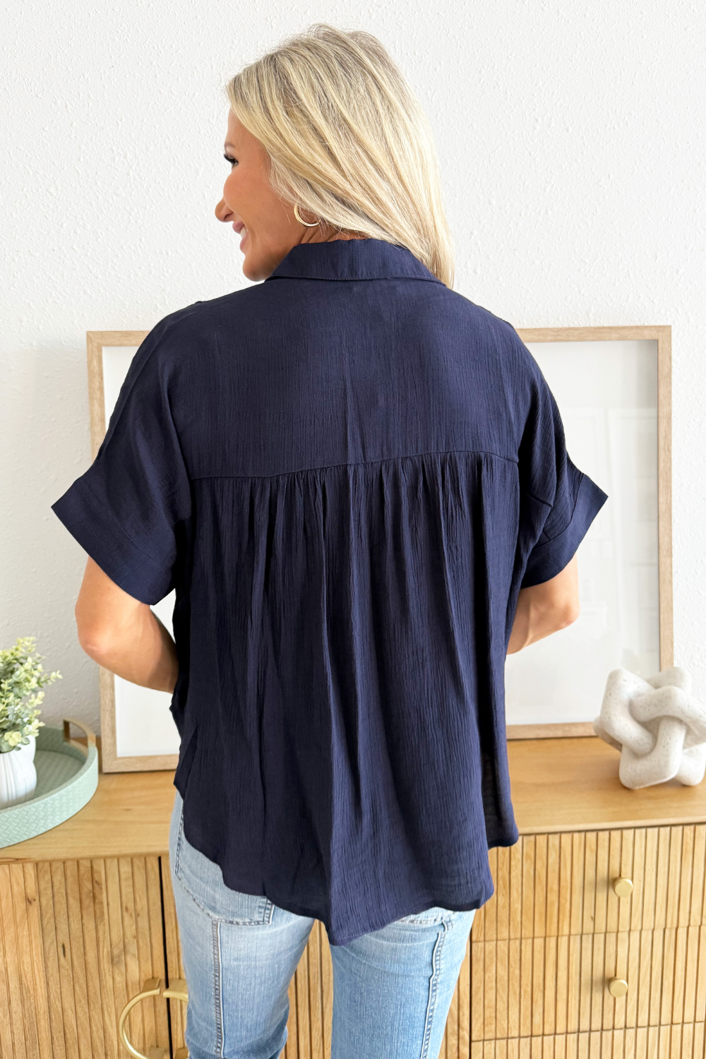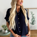 The Solid Short Sleeve Button Down Top has a light and airy feel. This short sleeve top has a collared neckline, button front, and a high-low hem. The gathering detail at the back adds a flowy touch. Wear this top with your favorite denim or shorts for an easy casual look.