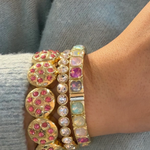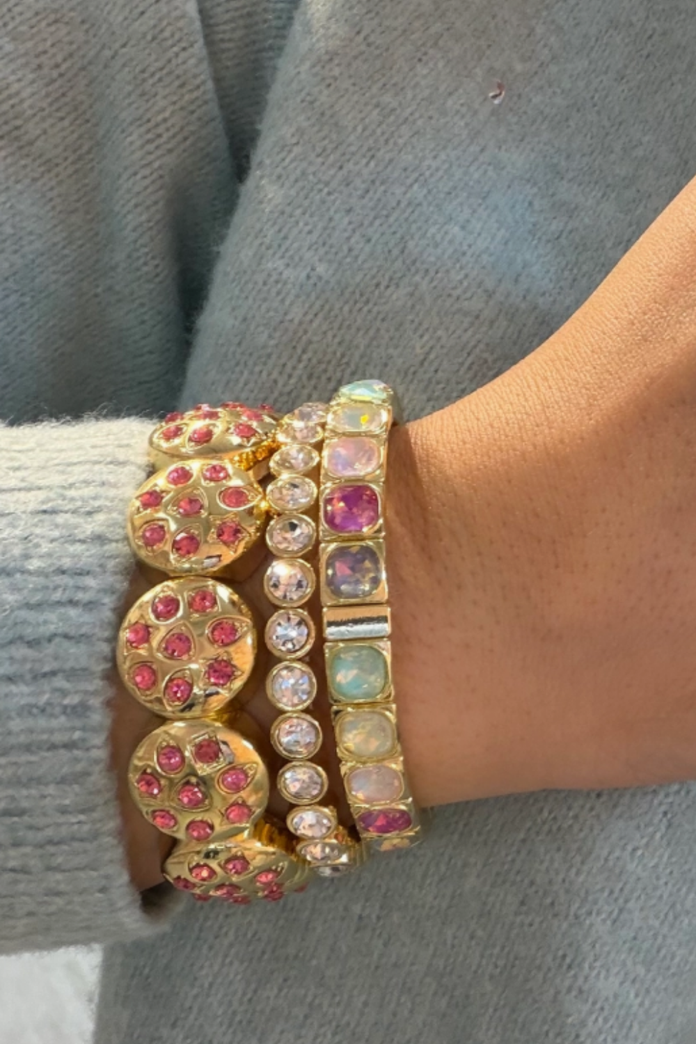 • Three-piece gold bracelet set featuring sparkling pink gems, clear crystals, and dreamy iridescent stones for a stylish layered look.