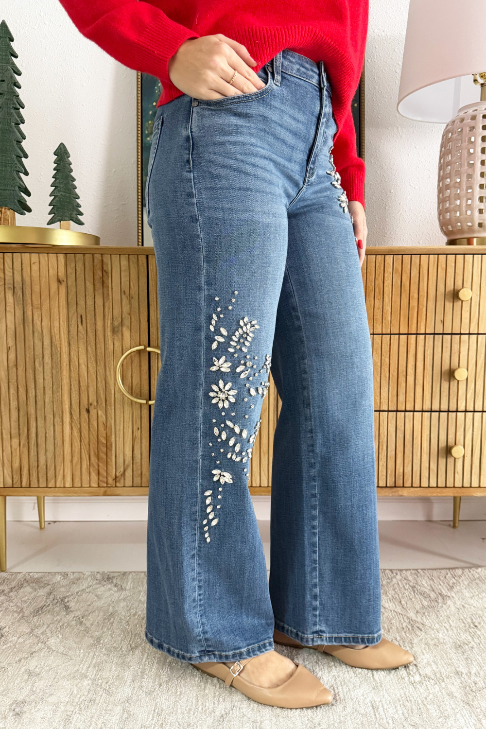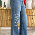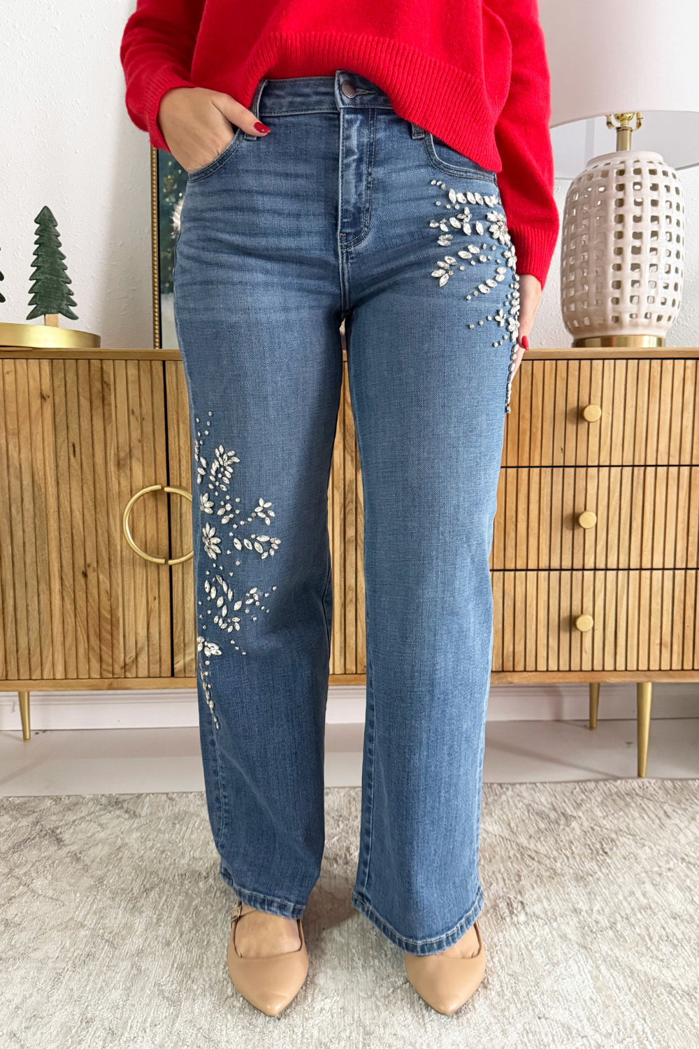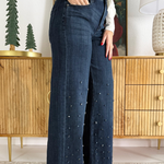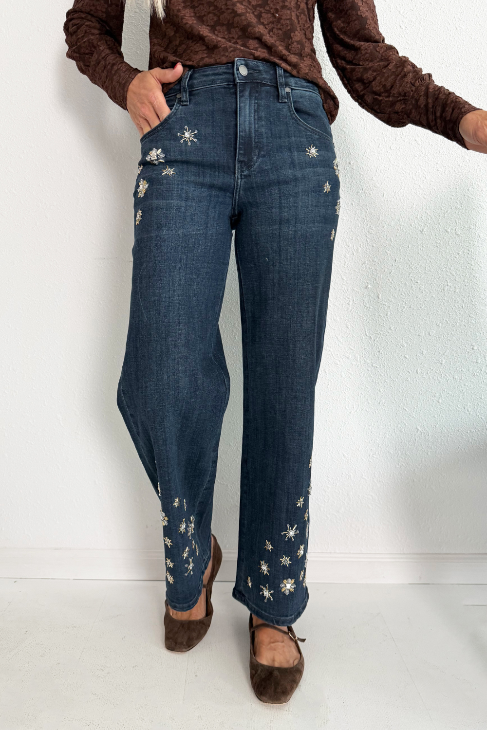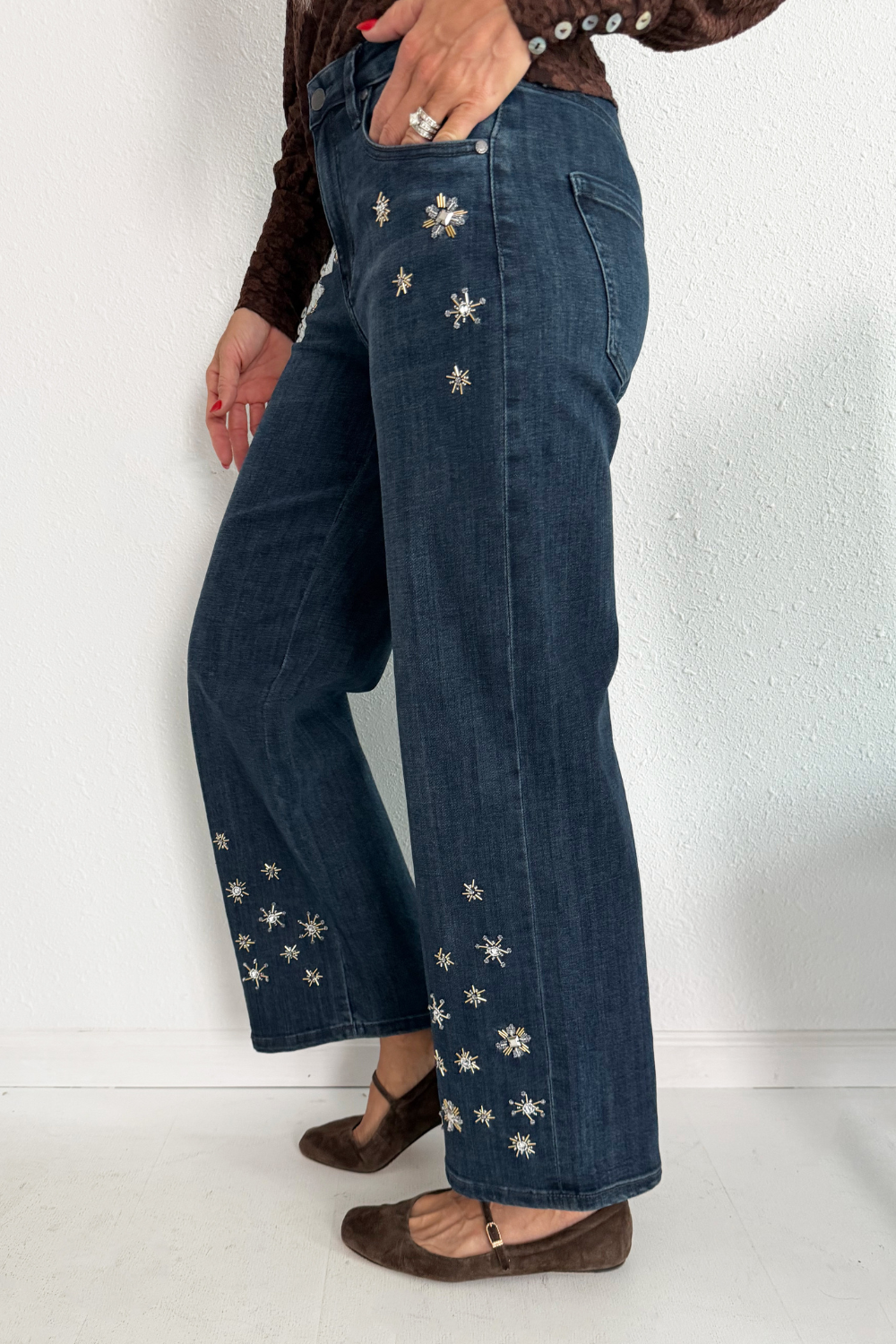 Where denim meets artistry. This wide leg features an intricate display of crystal embellishments that shimmer with effortless sophistication. Each detail catches the light in motion, creating a modern sense of celebration. Crafted with our signature soft stretch and structured drape, it brings contemporary glamour to a timeless silhouette.