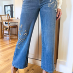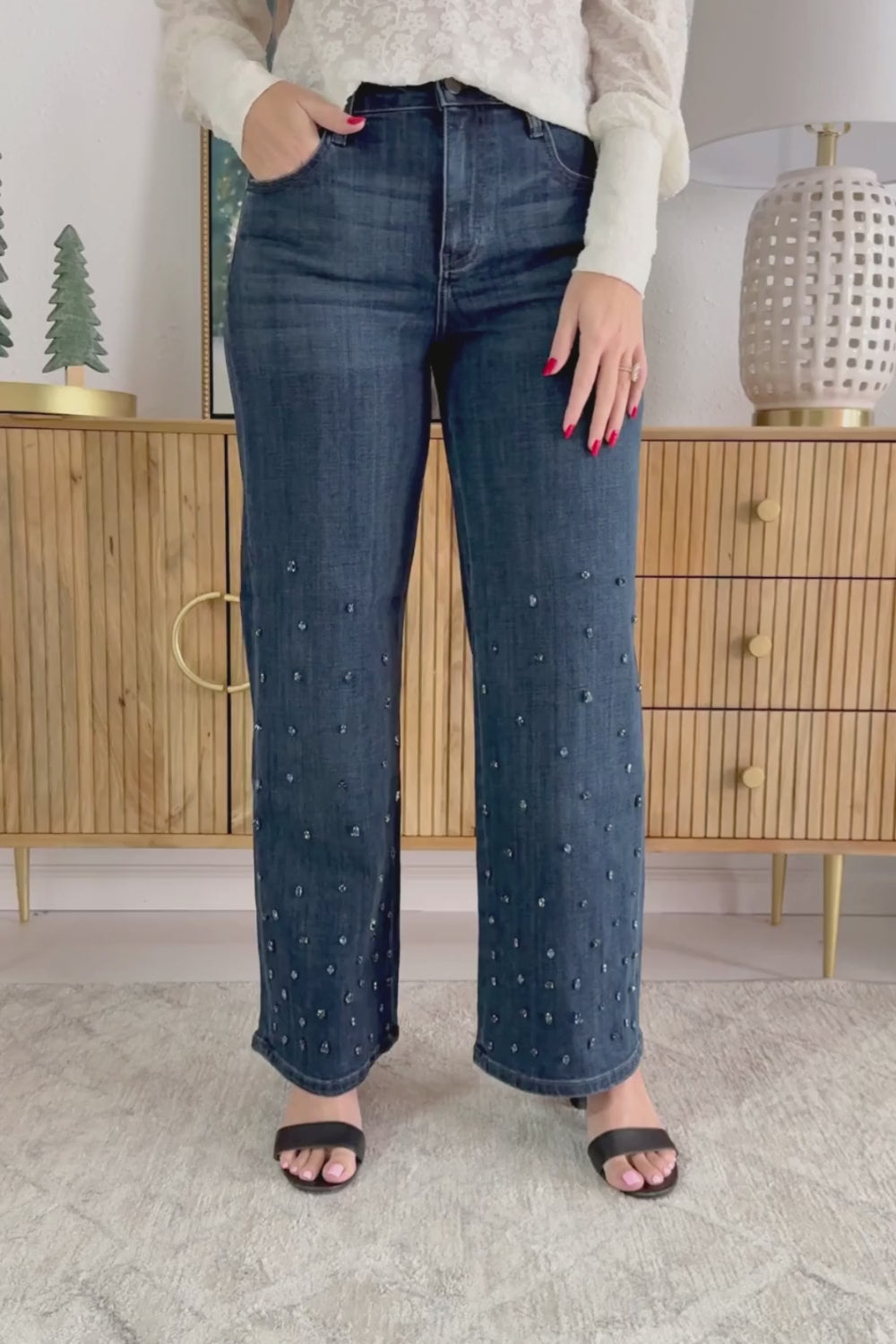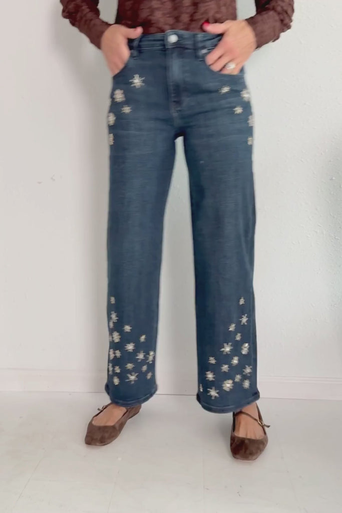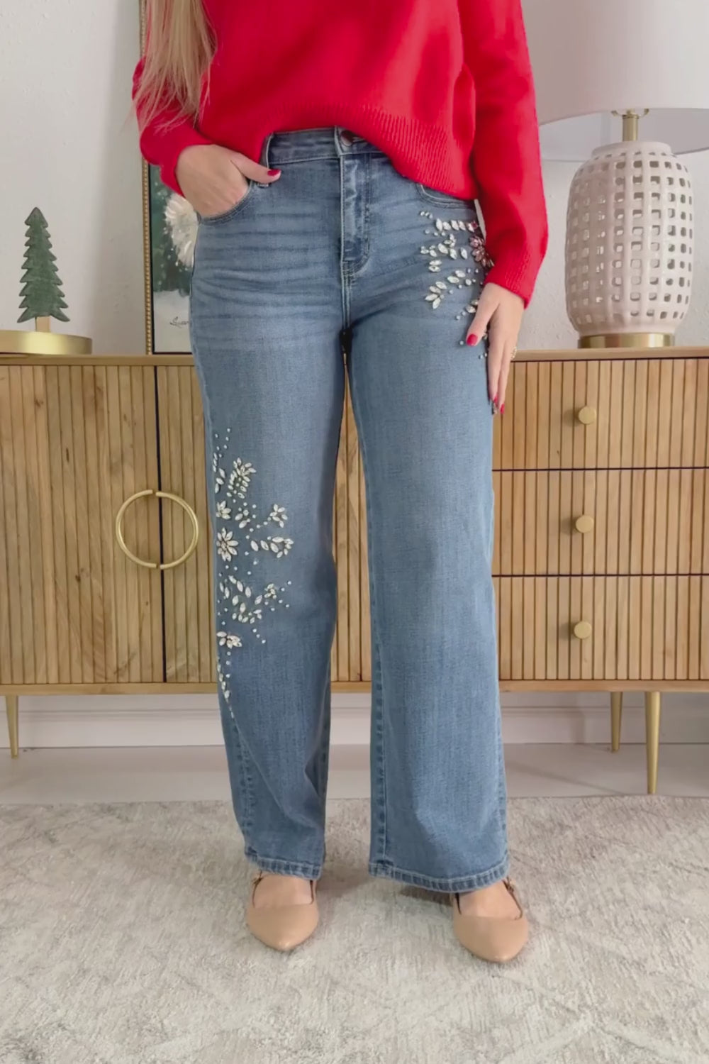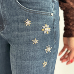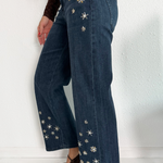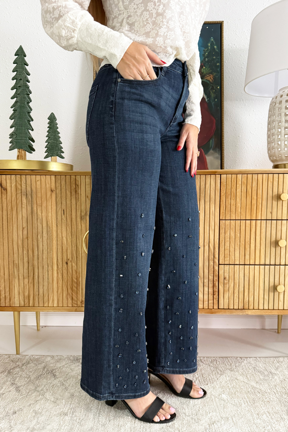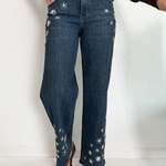 Where denim meets artistry. This wide leg features an intricate display of crystal embellishments that shimmer with effortless sophistication. Each detail catches the light in motion, creating a modern sense of celebration. Crafted with our signature soft stretch and structured drape, it brings contemporary glamour to a timeless silhouette.