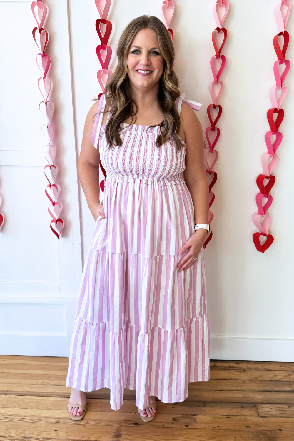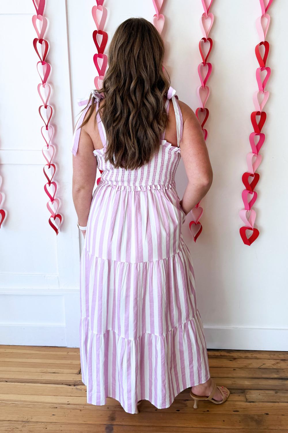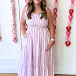 A flattering and easy-to-wear Stripe Tie Shoulder Smocked Midi Dress. The tiered skirt adds soft movement, while the orchid and white stripe pattern keeps the look fresh and feminine. Perfect for warm-weather outings and casual events.
