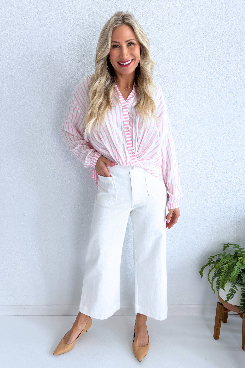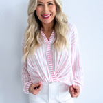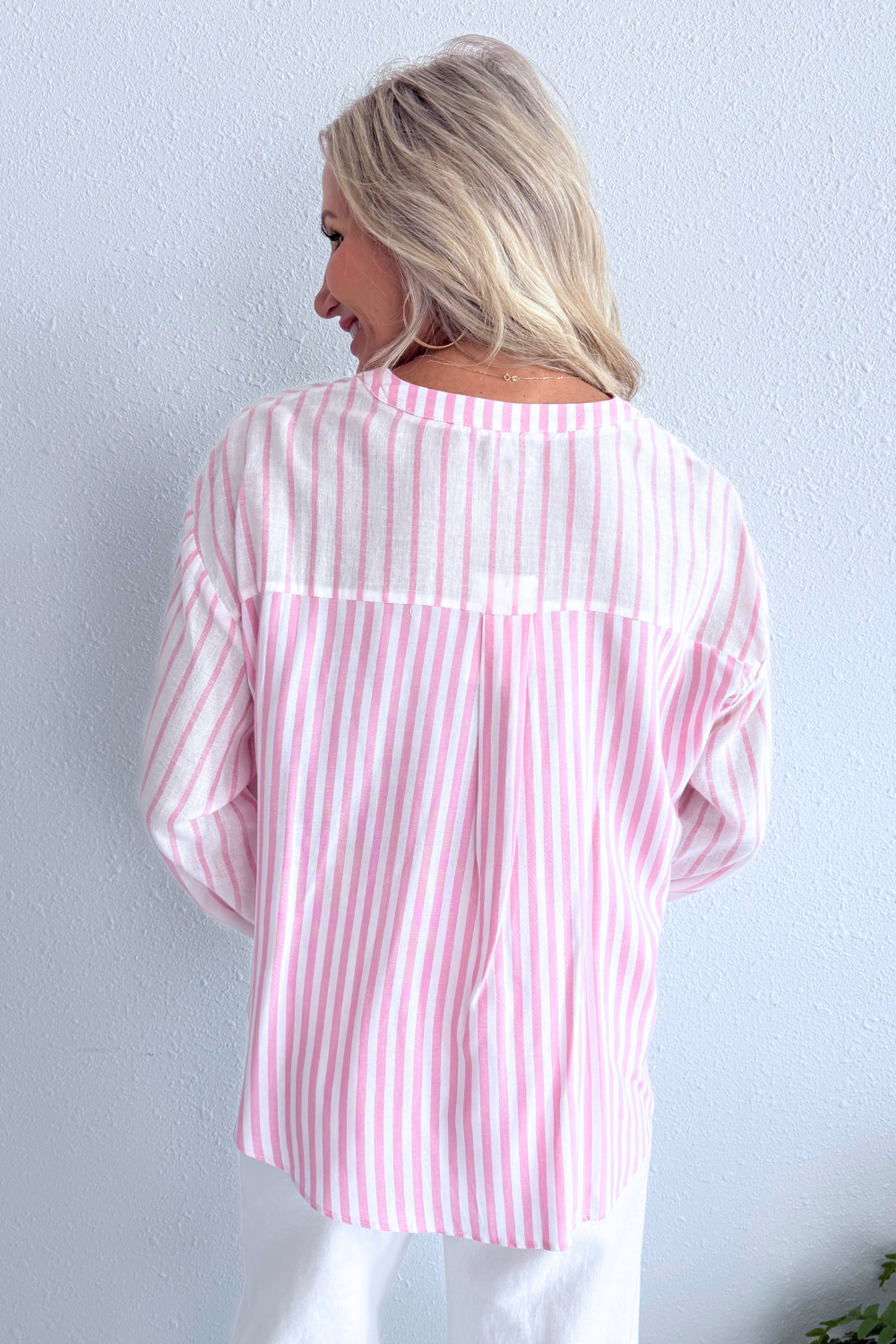 Classic with a fresh, feminine twist. This striped button-front top is the perfect blend of polished and effortless. Featuring a lightweight, breathable fabric with soft pink stripes, it offers a relaxed yet dressy fit that’s easy to style. The button-down front and long sleeves add timeless appeal, while the slightly flowy silhouette makes it flattering and comfortable all day long. Wear it tucked into trousers for a chic look or style it loose with denim for an elevated casual vibe.