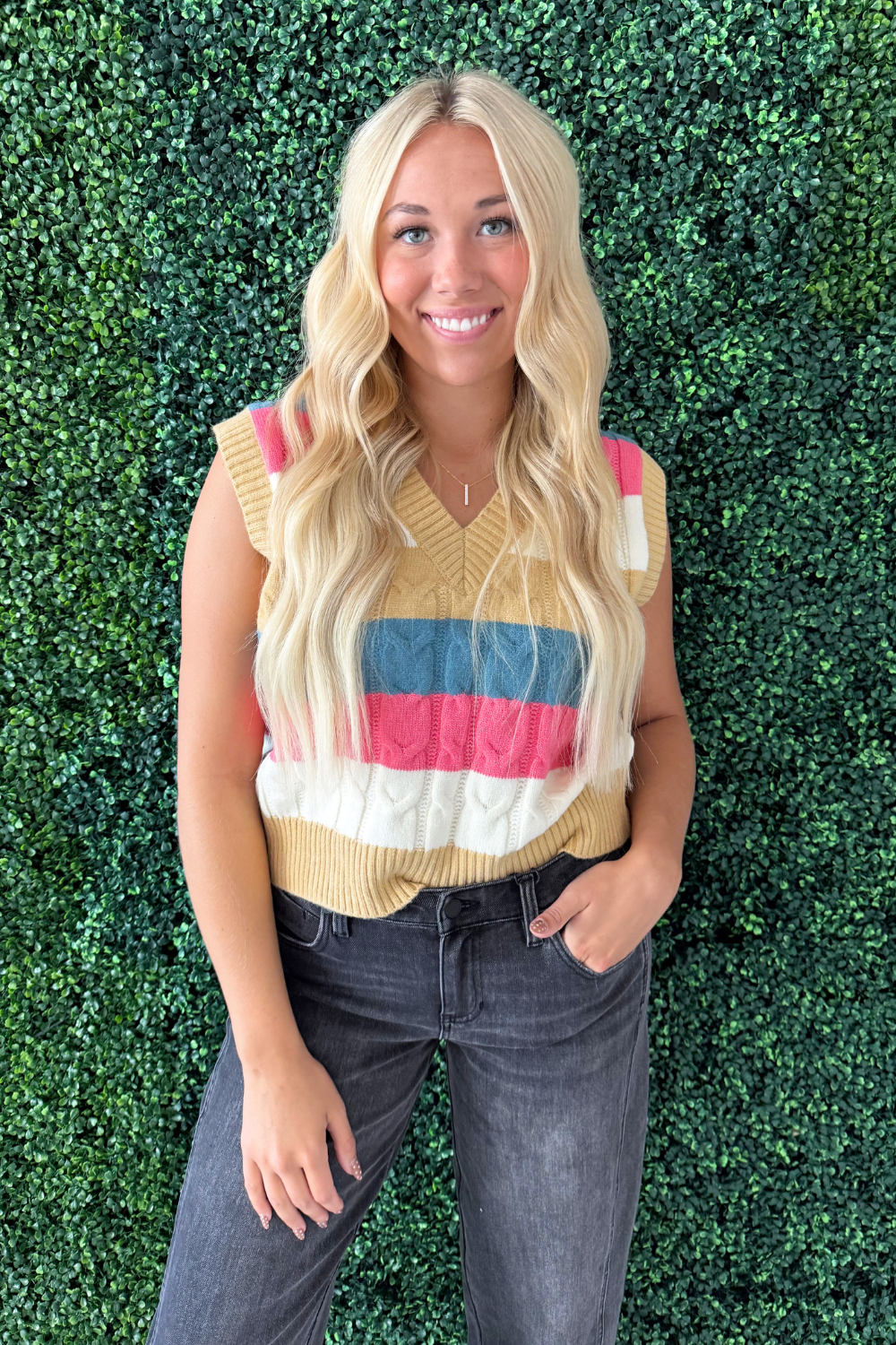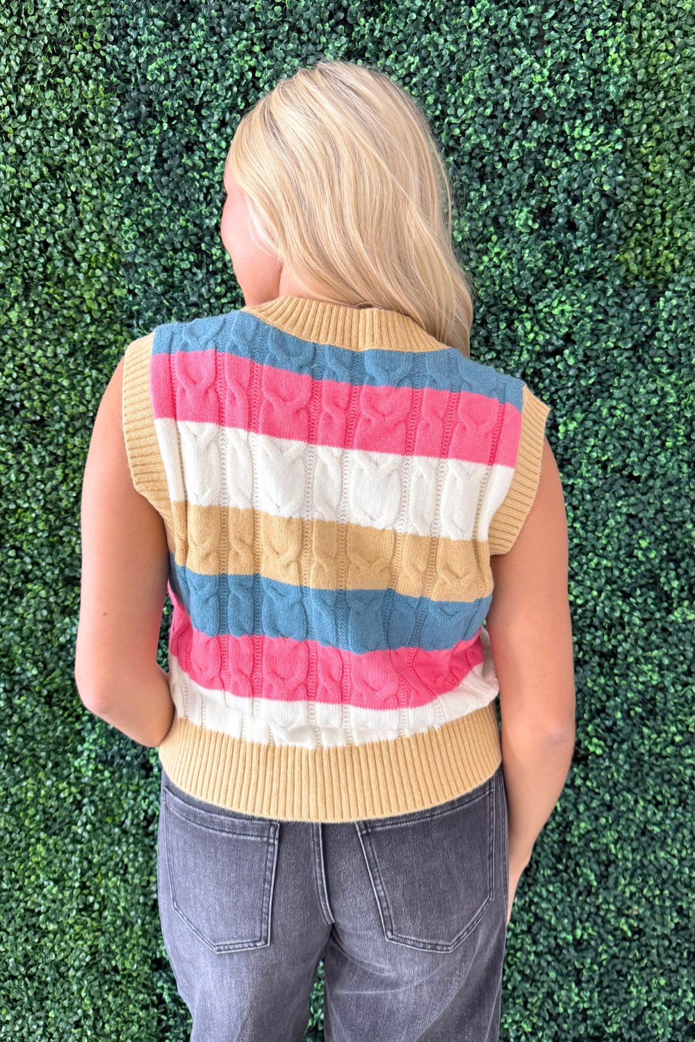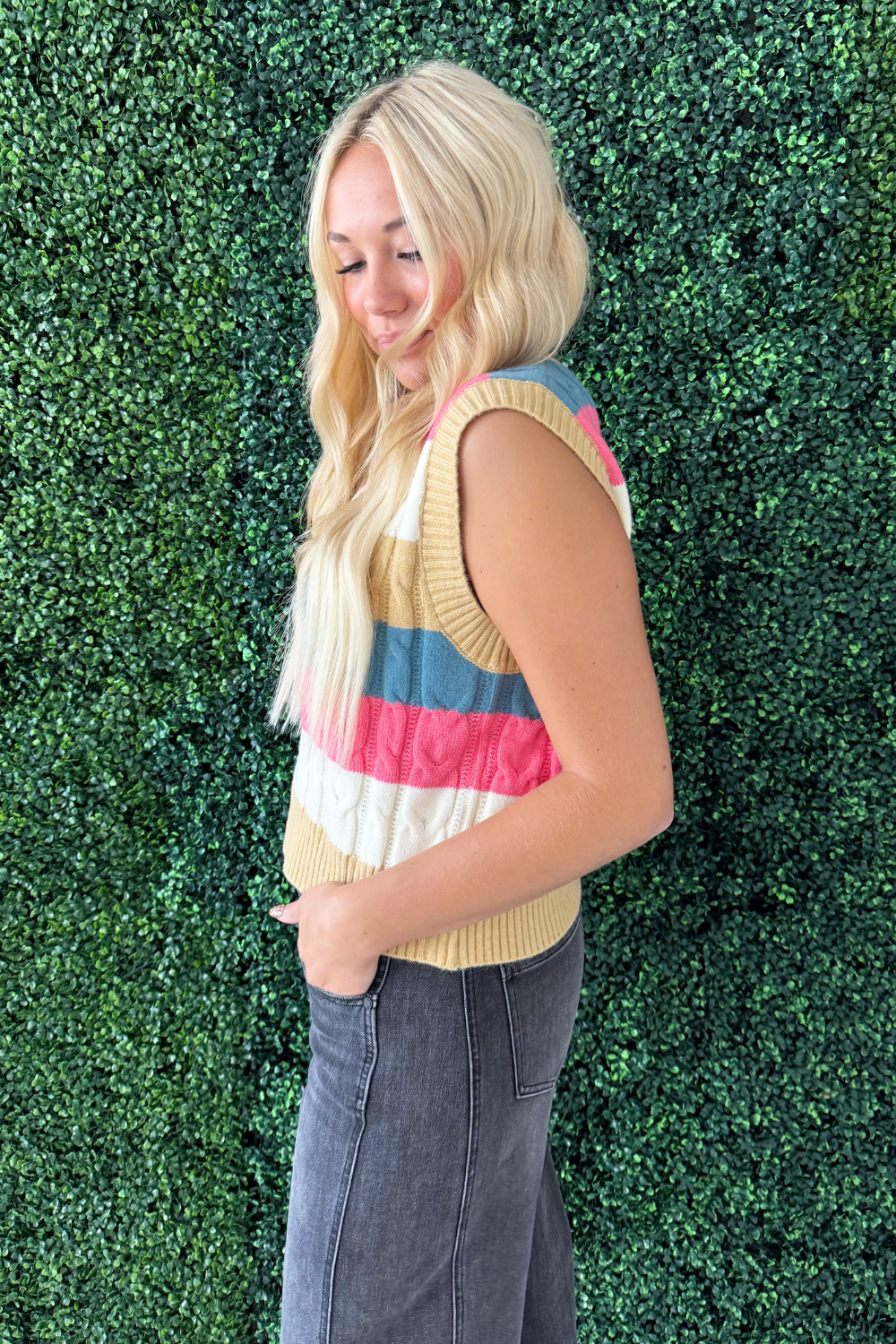 Perfect for year round wear, this striped cable knit sweater vest needs to be your newest wardrobe addition! Wear on its own or layer it over a long sleeve and pair back to denim and flats or sneakers for an effortless, laid-back look!
