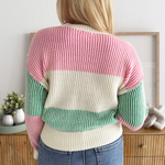 Add a pop of color to your fall wardrobe with this striped sweater! Featuring contrasting cuffs, neckline, waistband and a knitted material, this sweater is perfect for any fall day! Wear on its own or layer under a jacket for a comfy casual look!