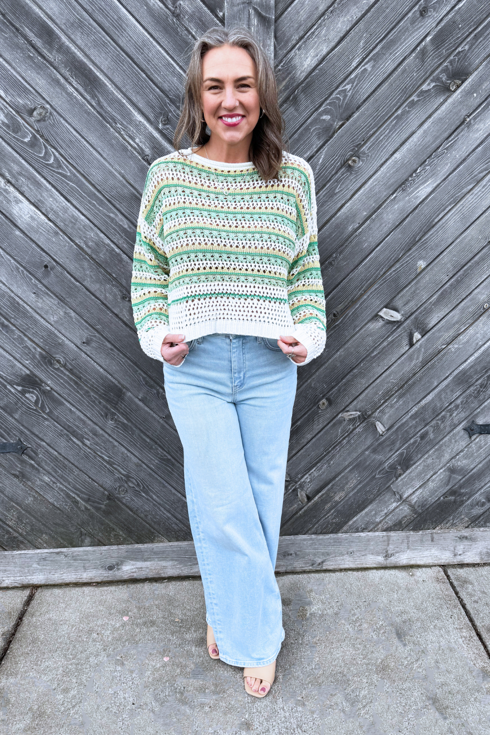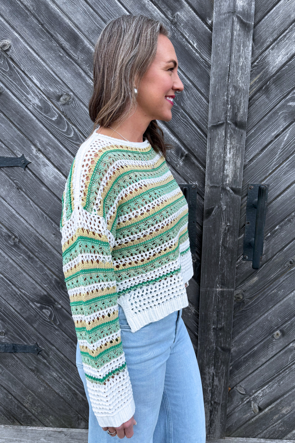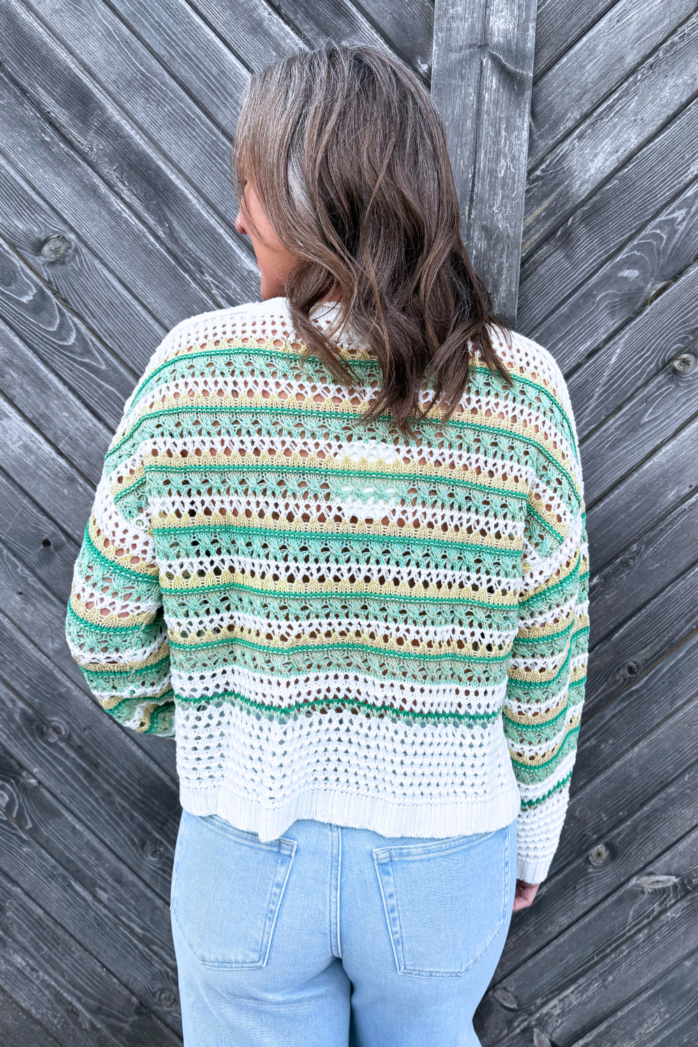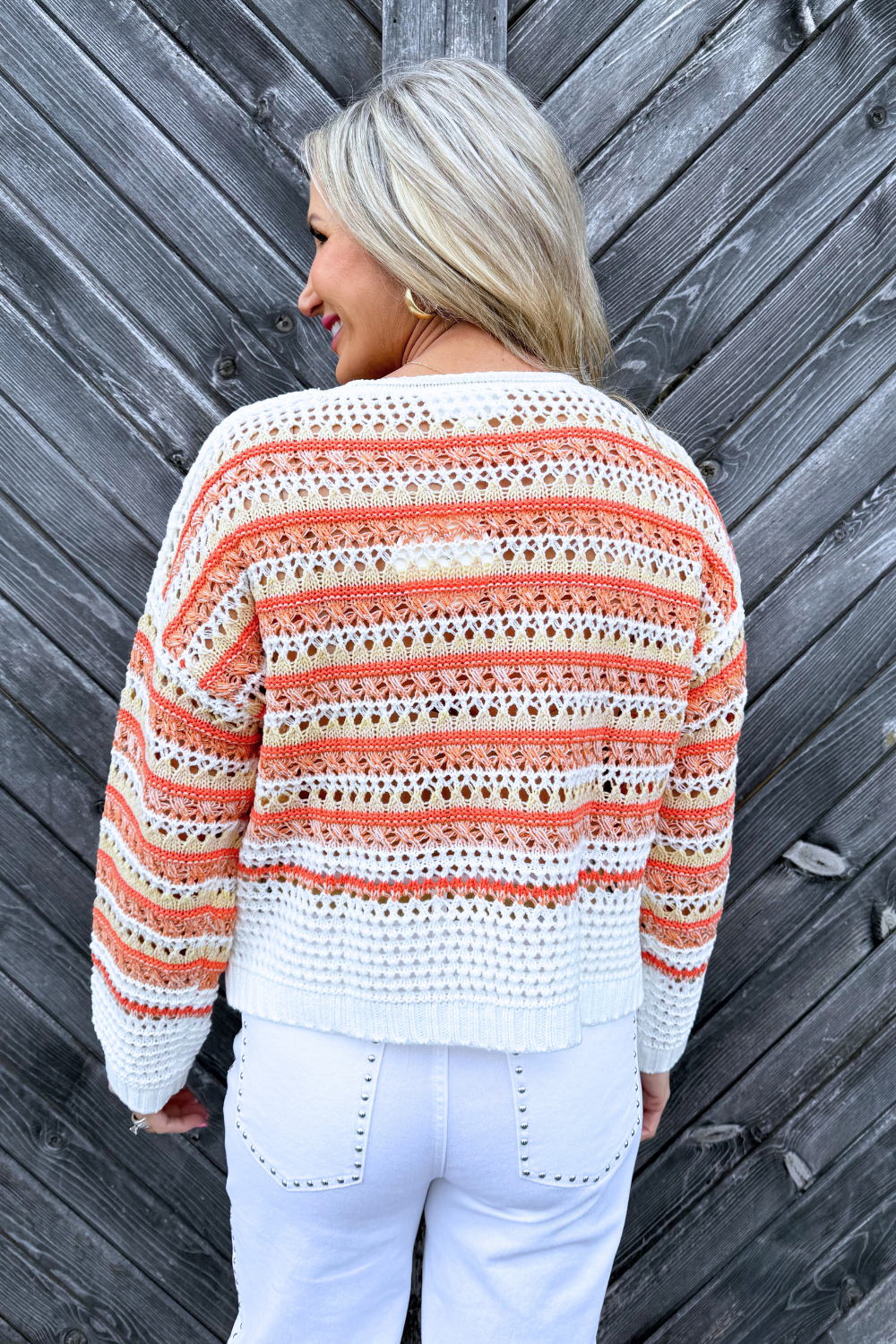This striped open knit sweater is the perfect lightweight layer for transitioning between seasons. Designed with an airy knit and relaxed fit, it gives you that effortless, laid-back look while still feeling polished. Easy to throw on over a tank or bralette, it’s a go-to for casual days with just the right amount of texture.