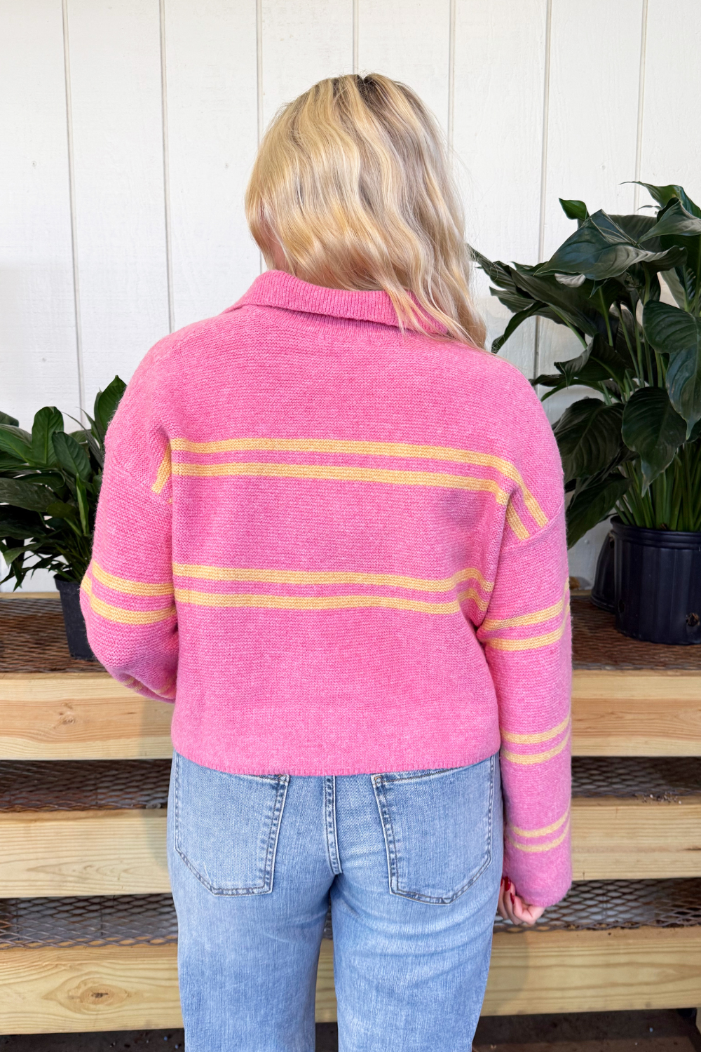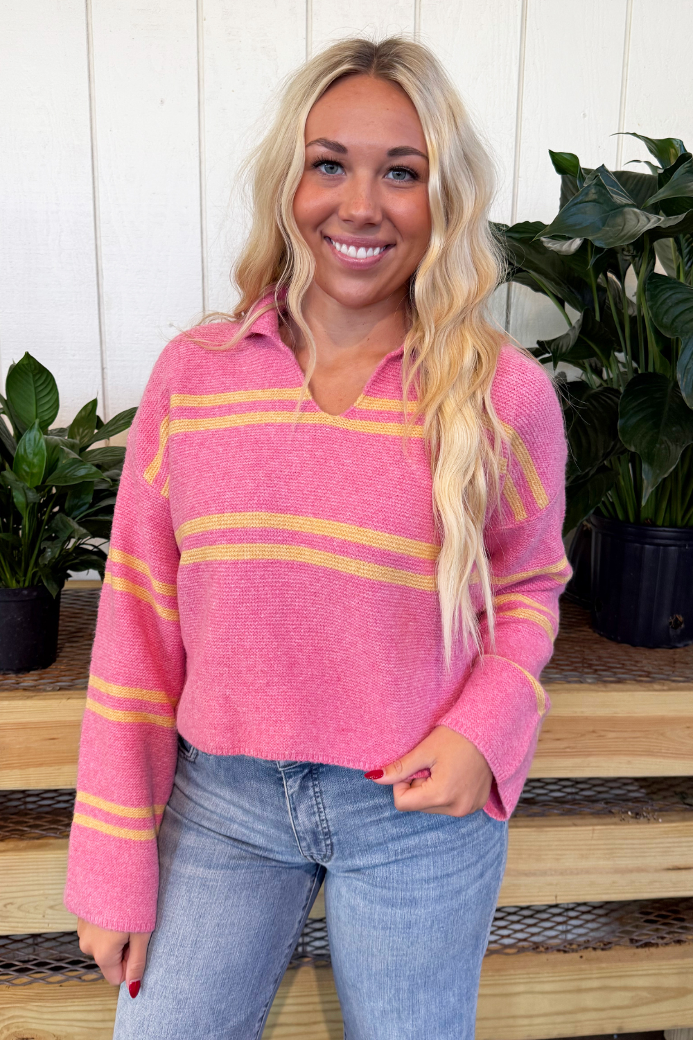 Classic and cozy, this striped V-neck long sleeve sweater is a timeless addition to your wardrobe. The soft knit fabric and relaxed fit make it perfect for everyday wear, while the V-neckline adds a touch of effortless style. Its clean stripe pattern brings a modern, versatile look that pairs easily with jeans, skirts, or trousers. Perfect for layering through the seasons!