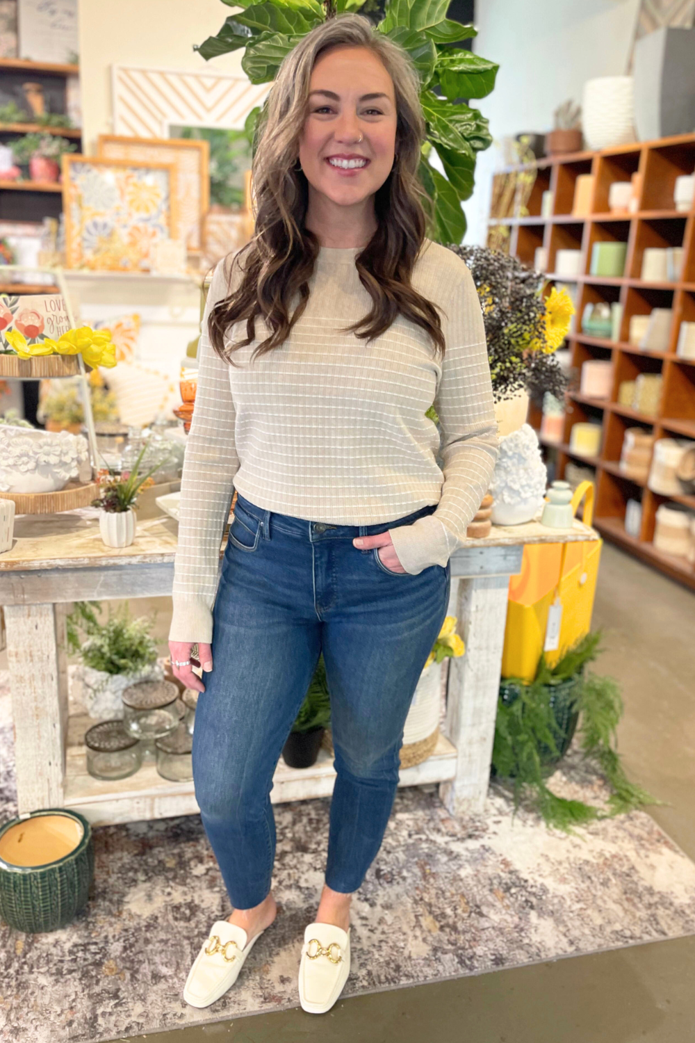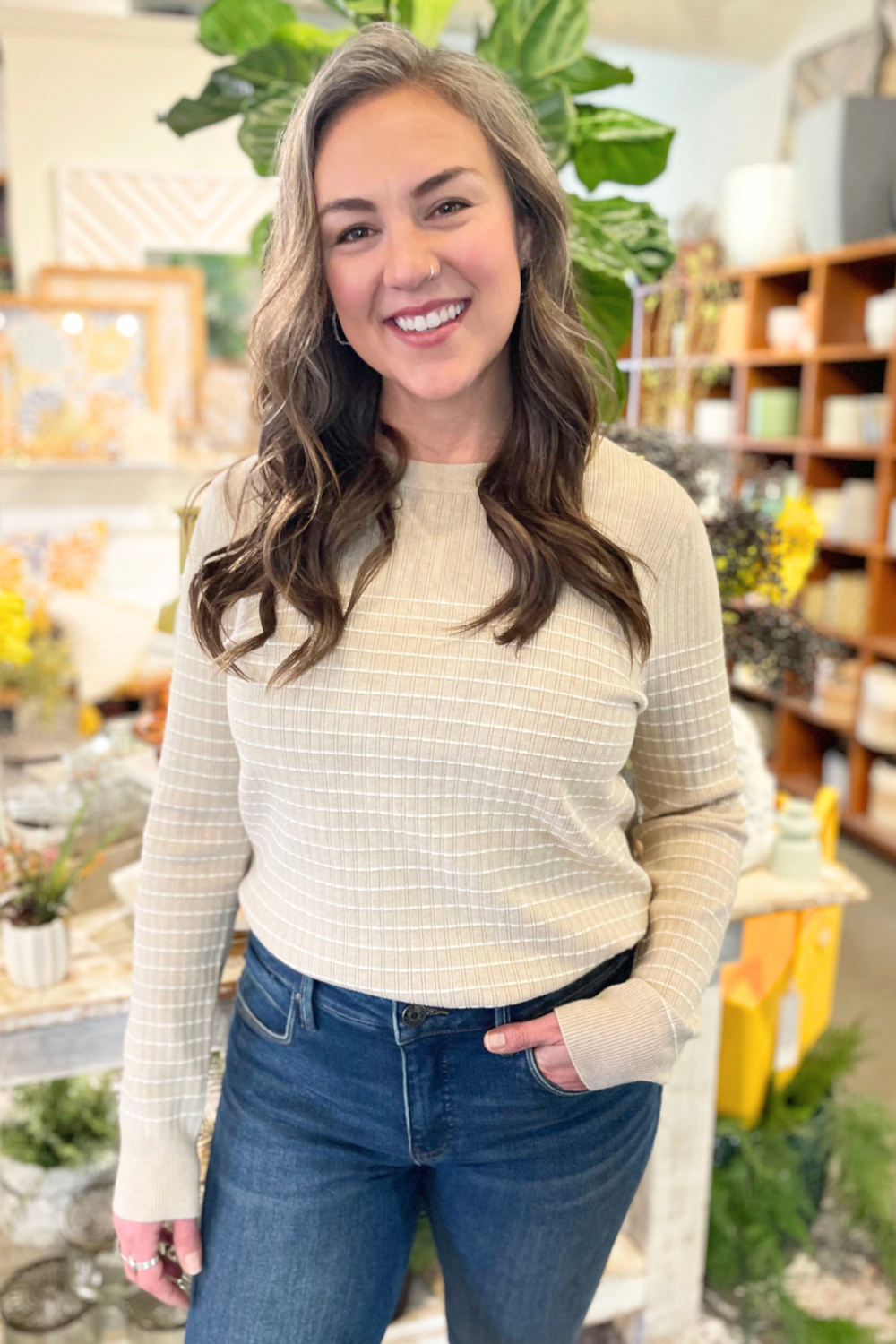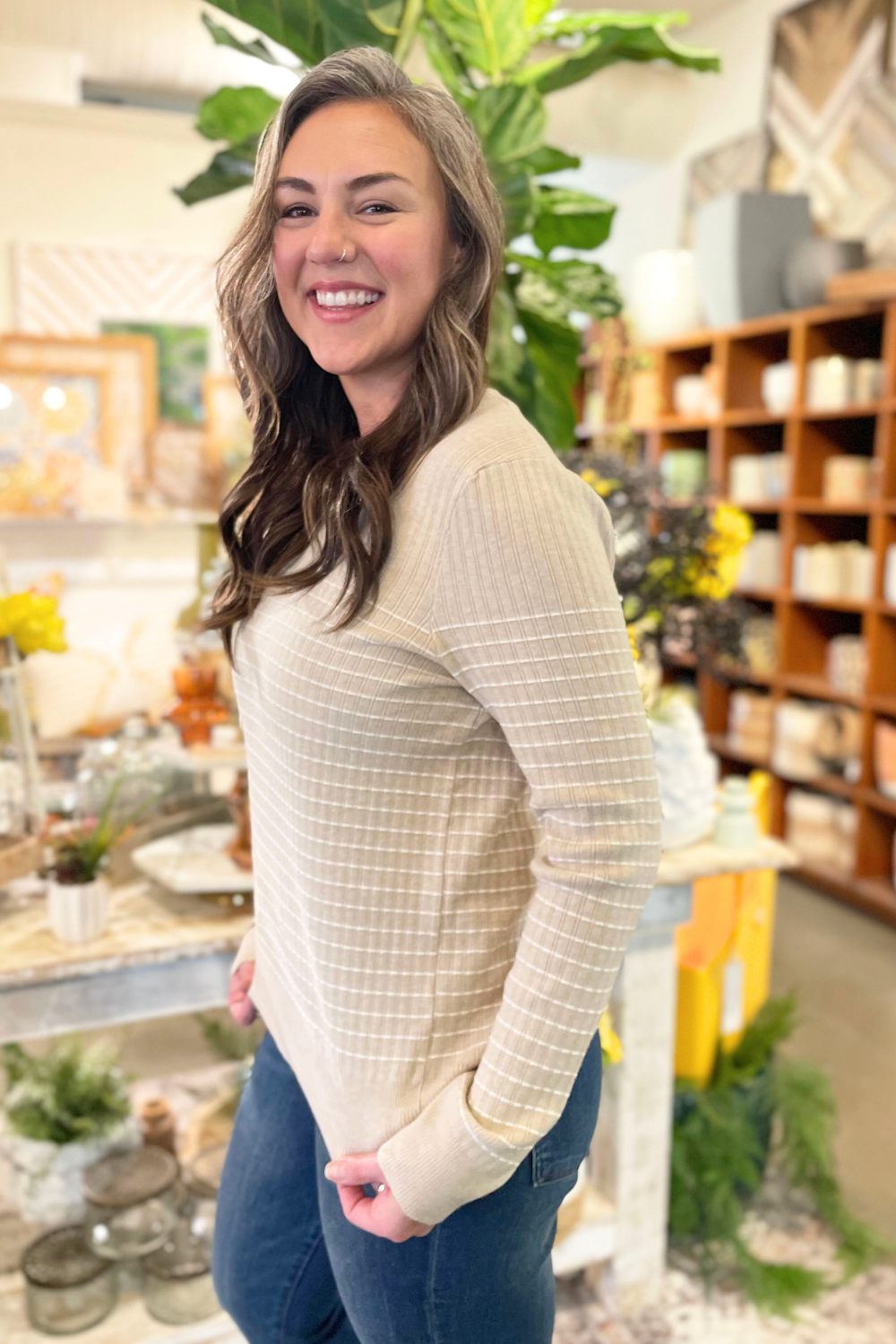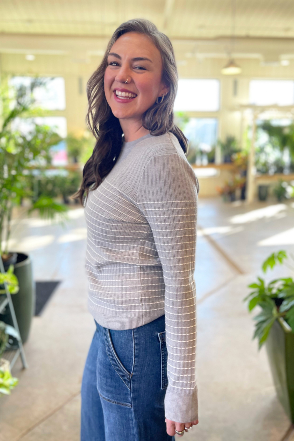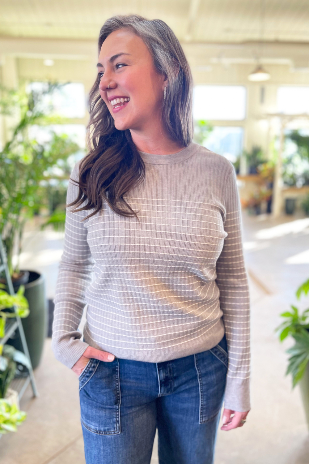 The Textured Stitch Stripe Crewneck Sweater is a great midweight sweater for spring. The crew neck sweater has a unique textured stitch stripe design. Pair it with your favorite denim and you are ready for the day.