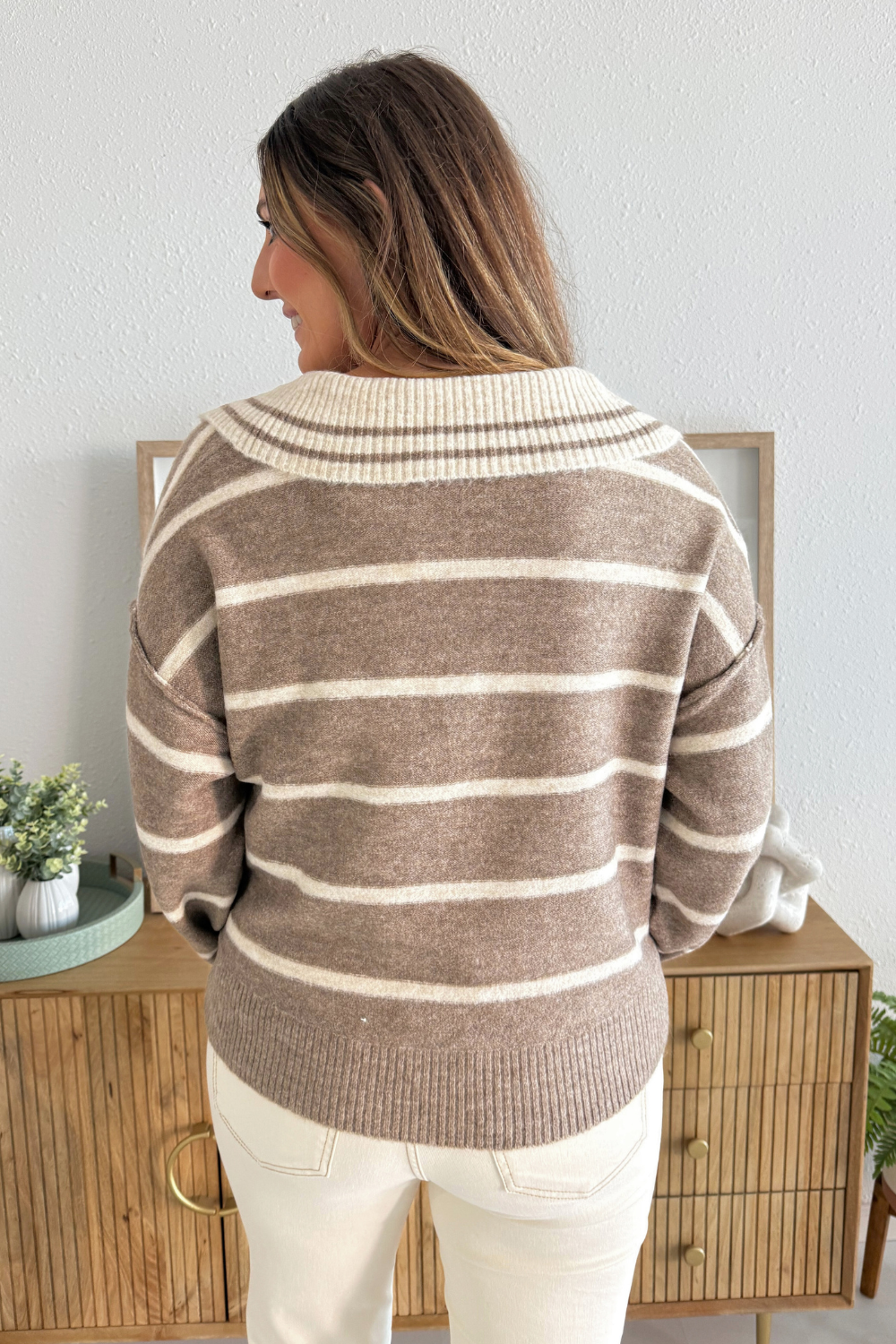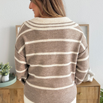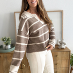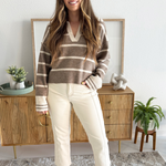 The Cheshire Pullover will have you ready for fall. This long sleeve sweater has a collared V neck, drop shoulder, and striped design. The contrasting collar and cuff add a unique touch. Add your favorite denim and sneakers for an easy weekend look.