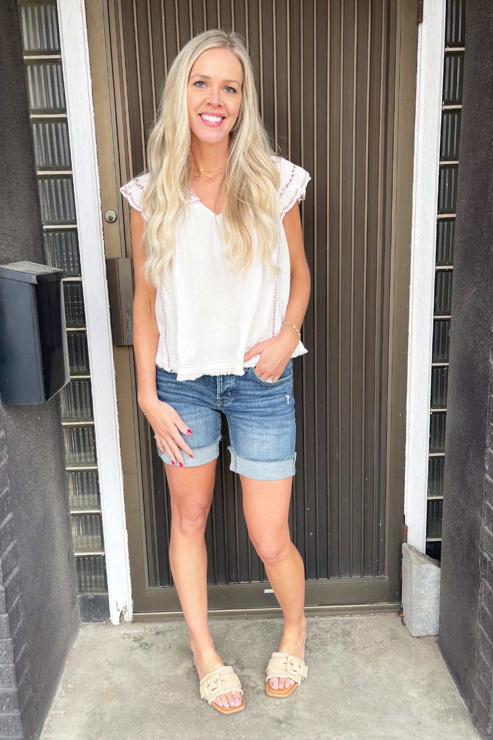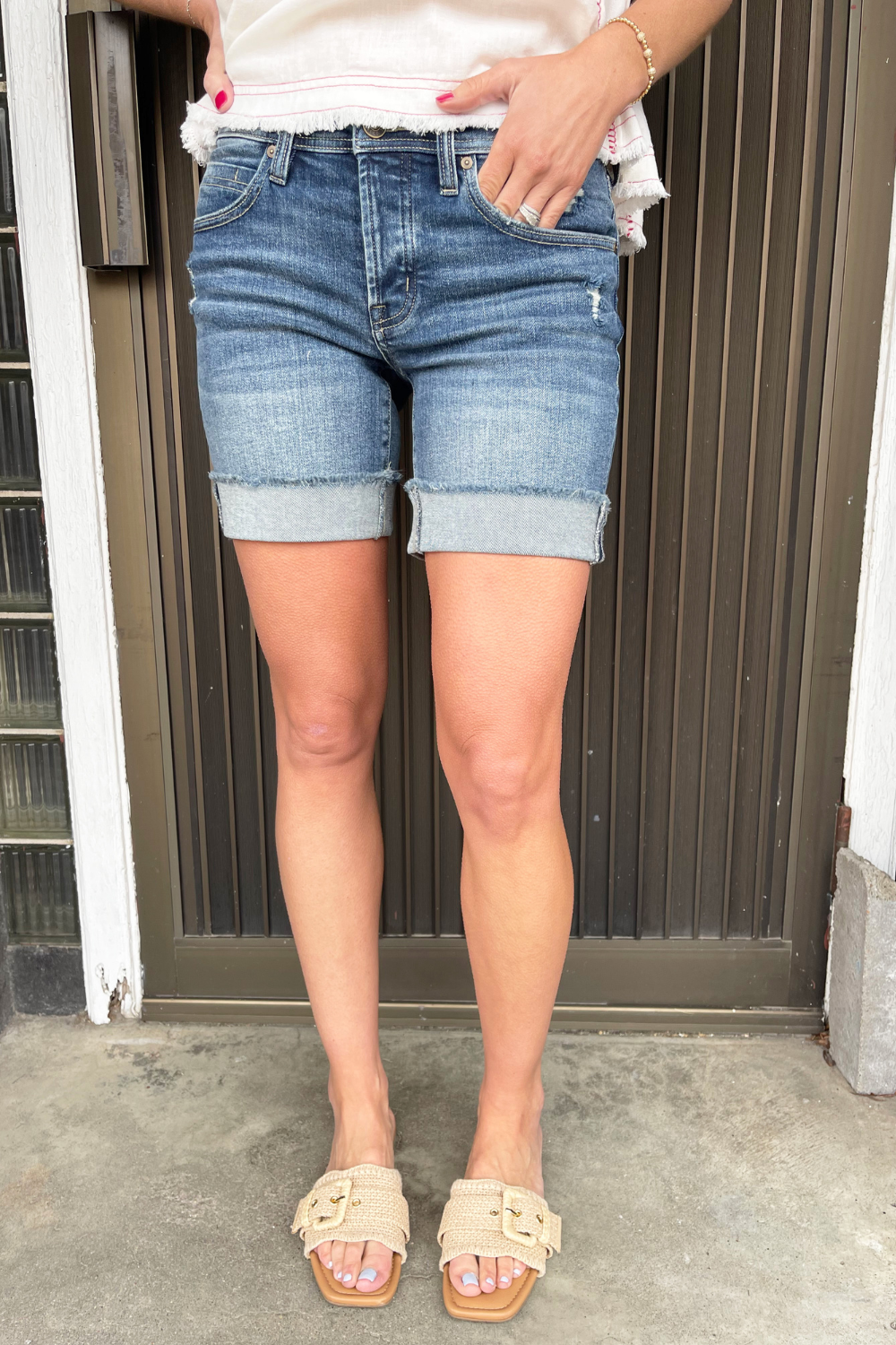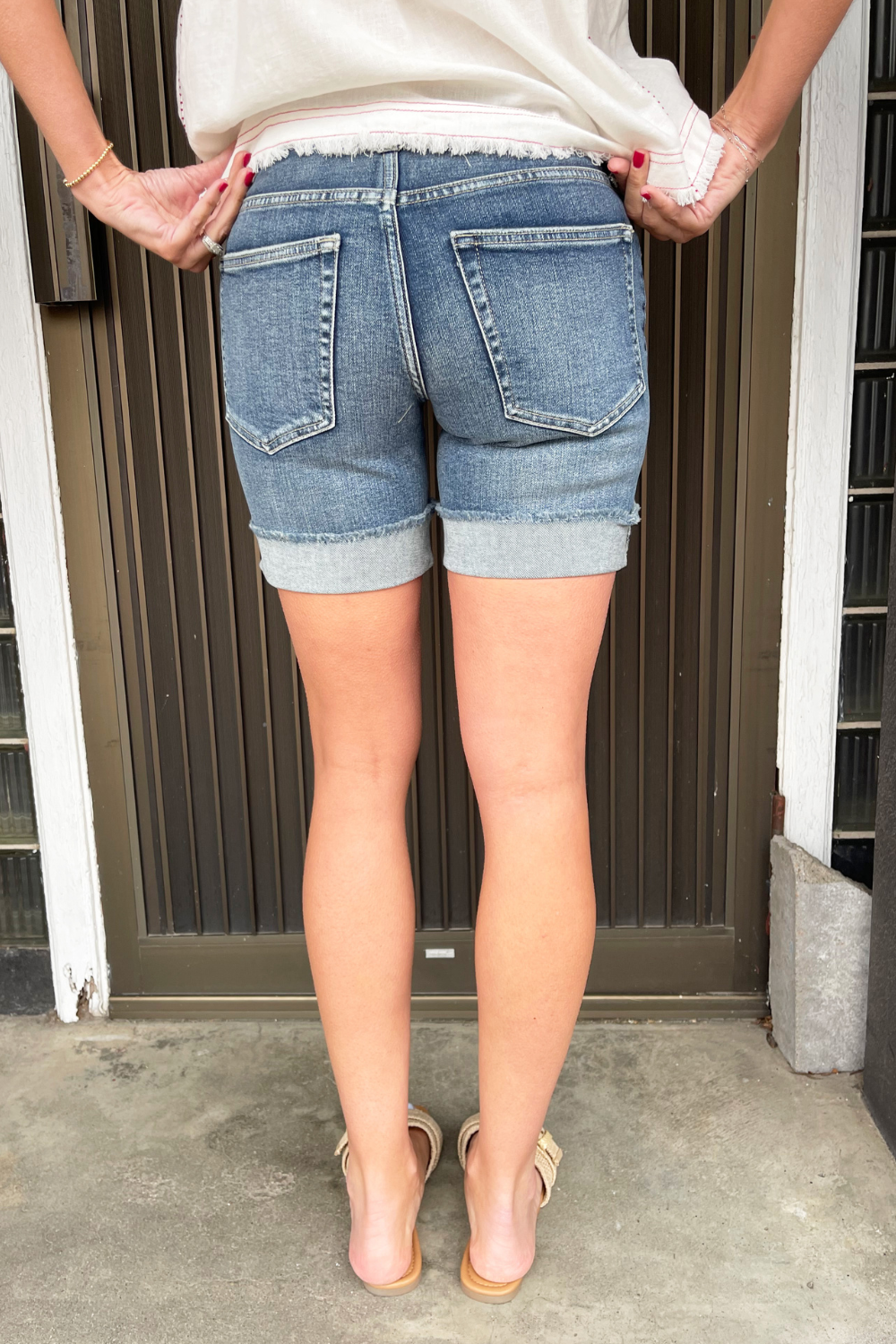 The Keeper Fray Cuff Short 9”ins/7”ins shorts from Liverpool are a fan favorite. They feature a mid-rise, hidden 4 button closure, and deep pockets. These shorts sit low on the hip and have a looser fit, making them the perfect boyfriend short.