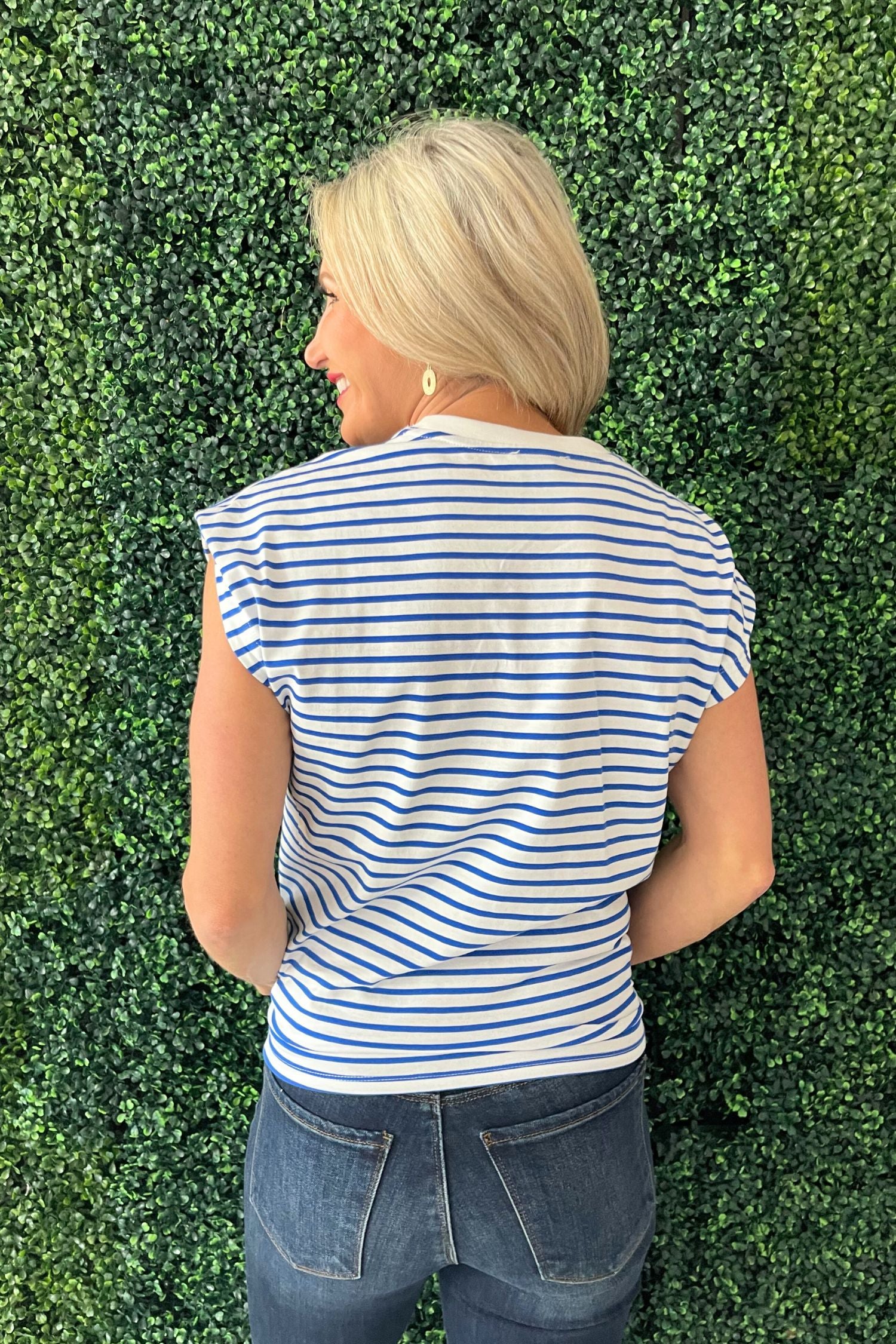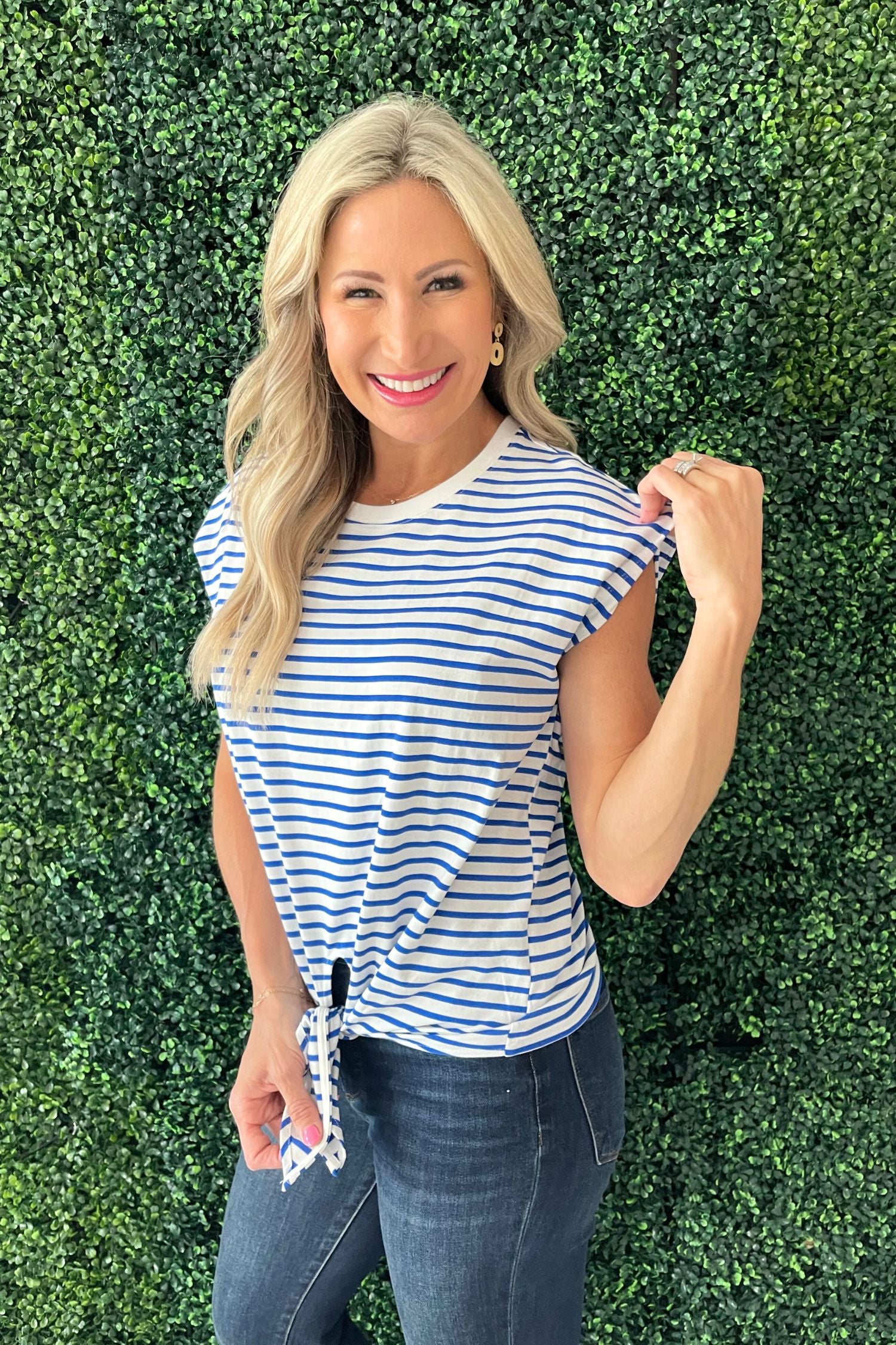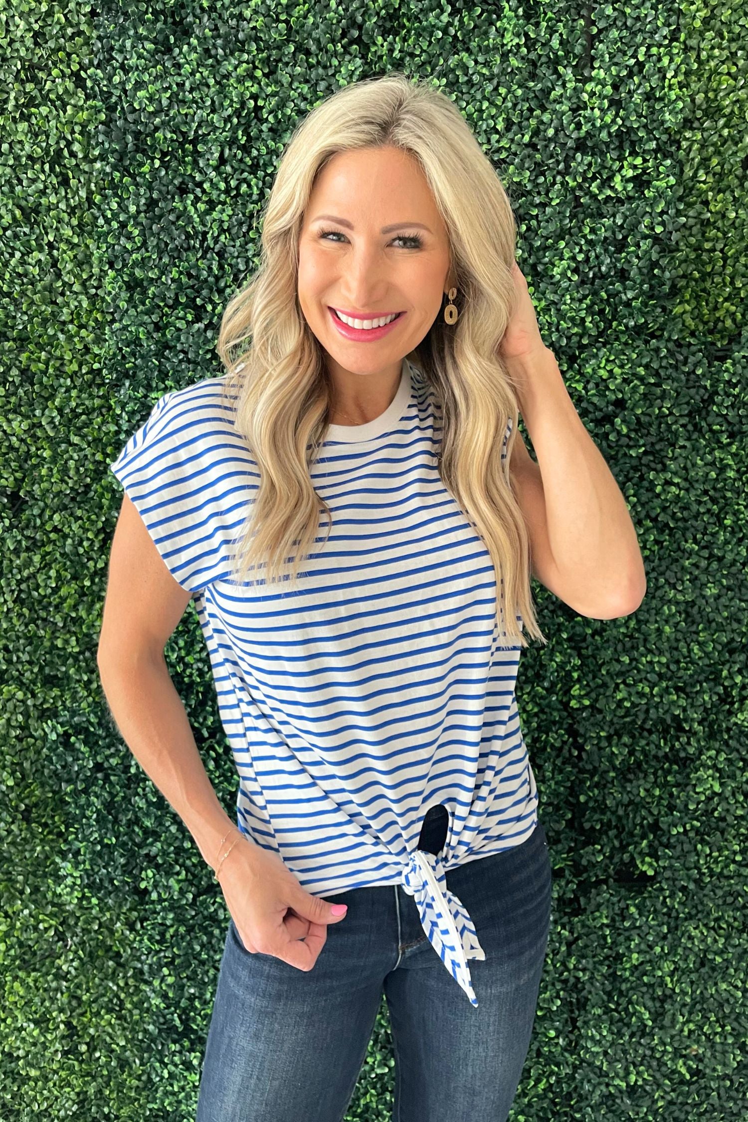 Classic stripes meet playful detail in the Tie Front Striped T-Shirt. The shirt has a fun tie-front design! Pair with your denim or white shorts for an easy spring look.